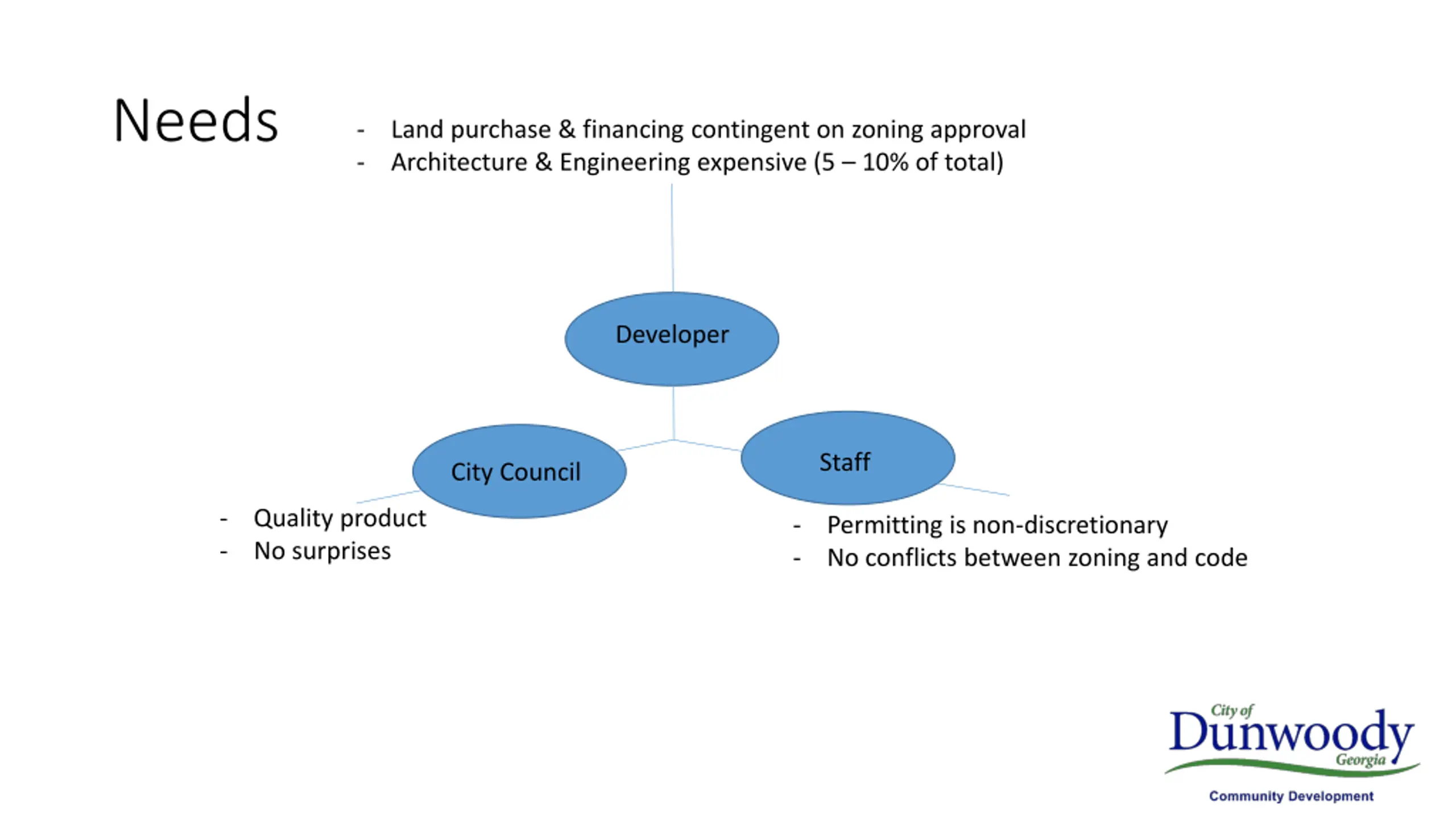 Needs - - Land purchase & financing contingent on zoning approval Architecture & Engineering expensive (5 10% of total) Developer Staff City Council - - Quality product No surprises - - Permitting is non-discretionary No conflicts between zoning and code