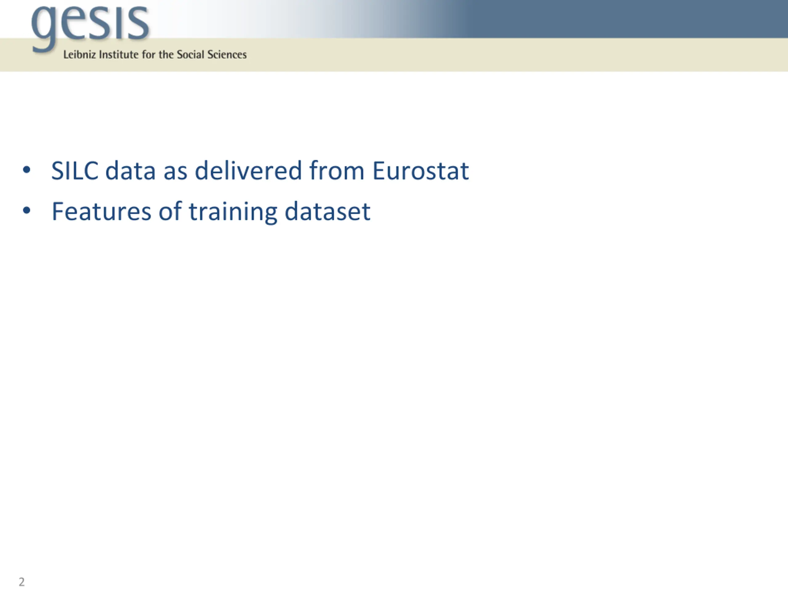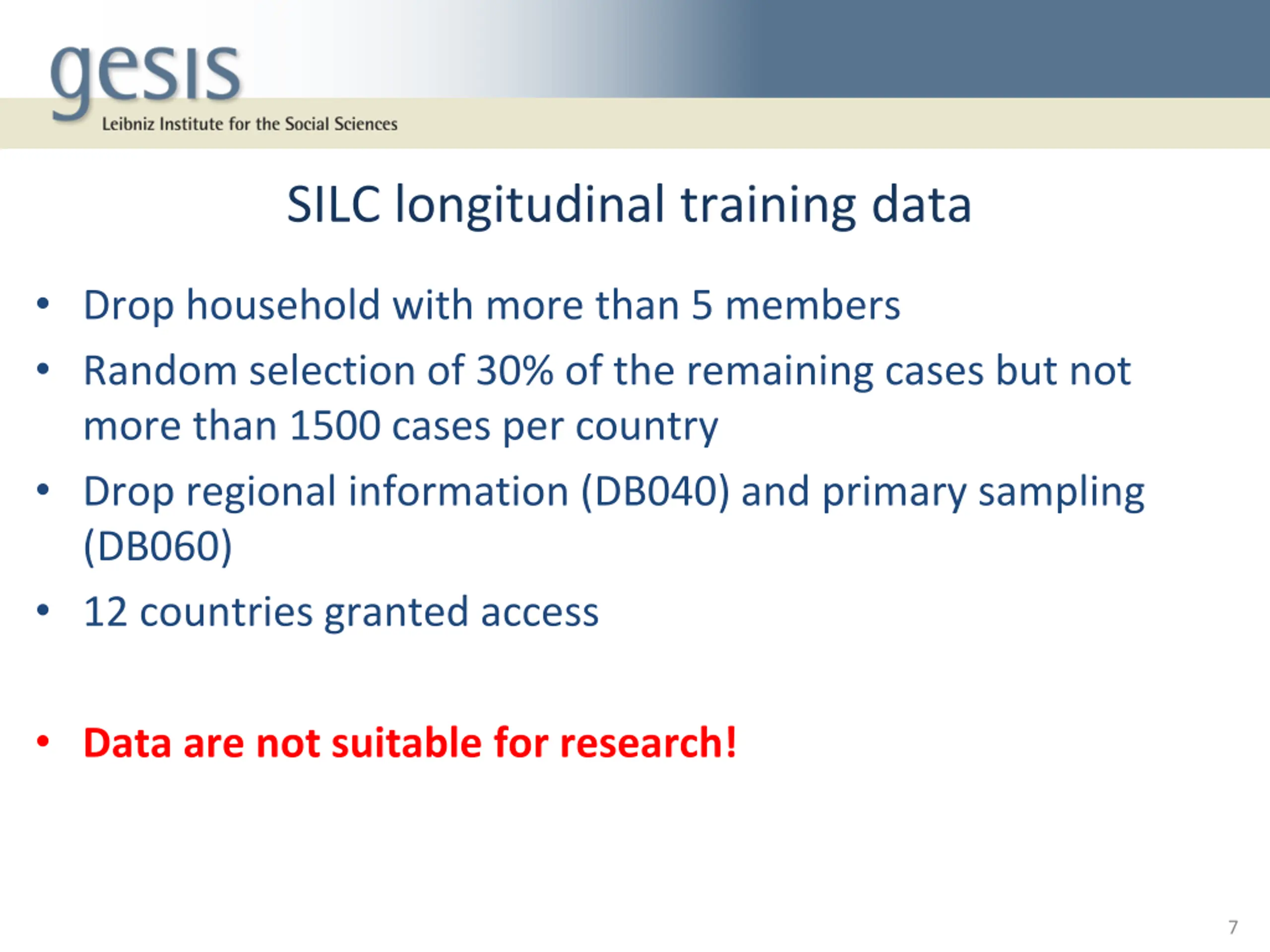 SILC longitudinal training data Drop household with more than 5 members Random selection of 30% of the remaining cases but not more than 1500 cases per country Drop regional information (DB040) and primary sampling (DB060) 12 countries granted access Data are not suitable for research! 7