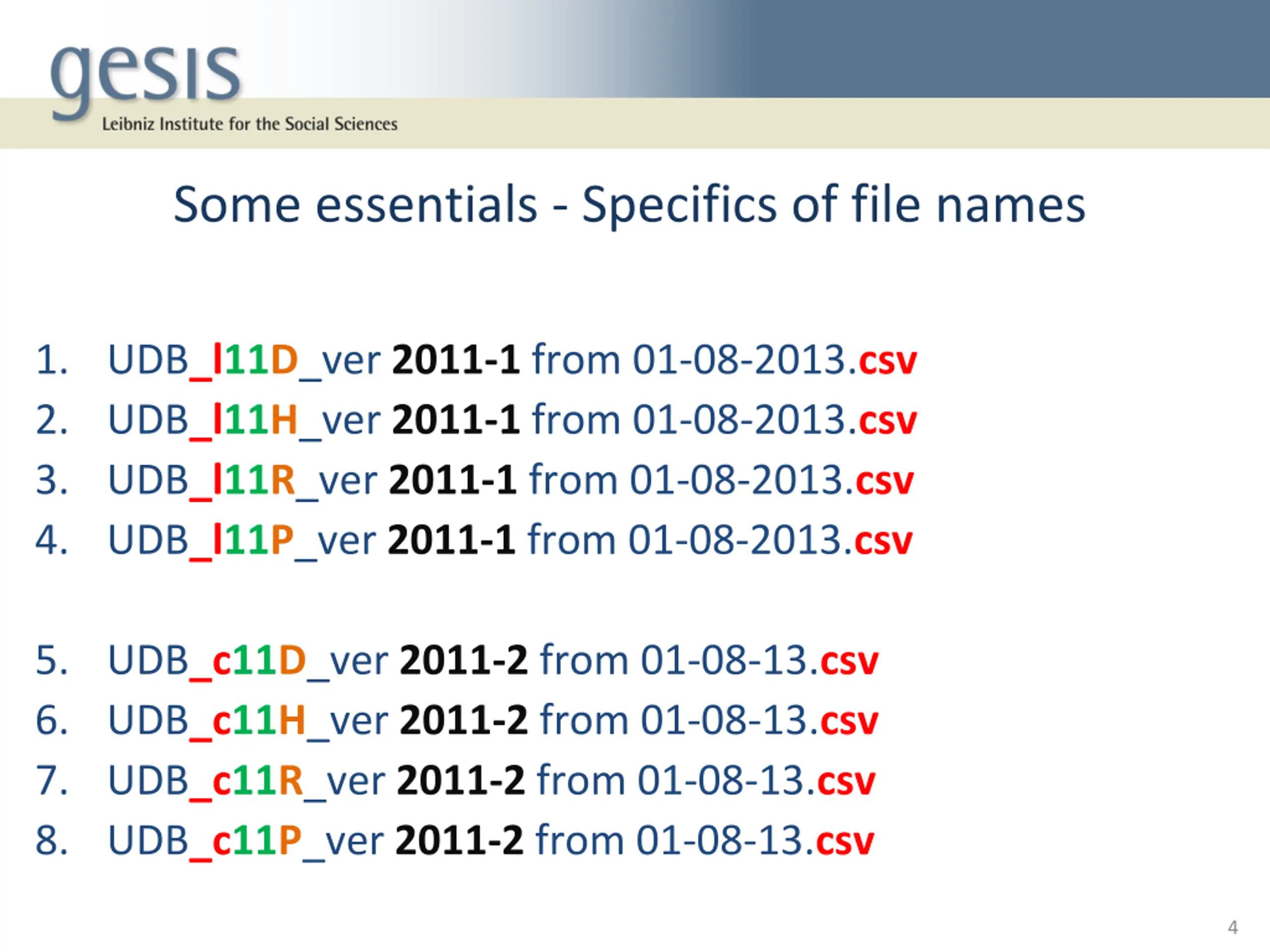 Some essentials - Specifics of file names 1. UDB_l11D_ver 2011-1 from 01-08-2013.csv 2. UDB_l11H_ver 2011-1 from 01-08-2013.csv 3. UDB_l11R_ver 2011-1 from 01-08-2013.csv 4. UDB_l11P_ver 2011-1 from 01-08-2013.csv 5. UDB_c11D_ver 2011-2 from 01-08-13.csv 6. UDB_c11H_ver 2011-2 from 01-08-13.csv 7. UDB_c11R_ver 2011-2 from 01-08-13.csv 8. UDB_c11P_ver 2011-2 from 01-08-13.csv 3