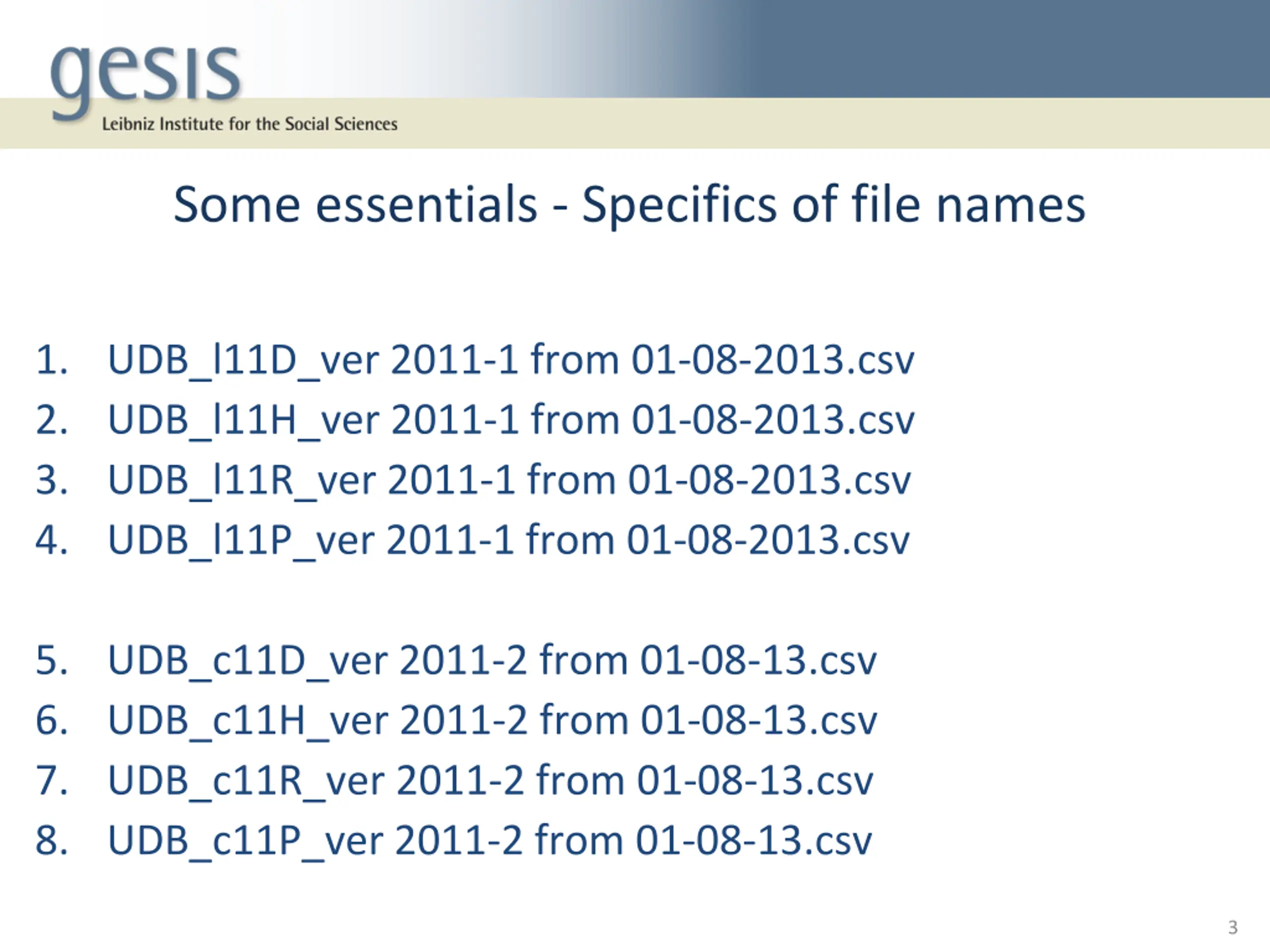 Some essentials - Specifics of file names 1. UDB_l11D_ver 2011-1 from 01-08-2013.csv 2. UDB_l11H_ver 2011-1 from 01-08-2013.csv 3. UDB_l11R_ver 2011-1 from 01-08-2013.csv 4. UDB_l11P_ver 2011-1 from 01-08-2013.csv 5. UDB_c11D_ver 2011-2 from 01-08-13.csv 6. UDB_c11H_ver 2011-2 from 01-08-13.csv 7. UDB_c11R_ver 2011-2 from 01-08-13.csv 8. UDB_c11P_ver 2011-2 from 01-08-13.csv 4