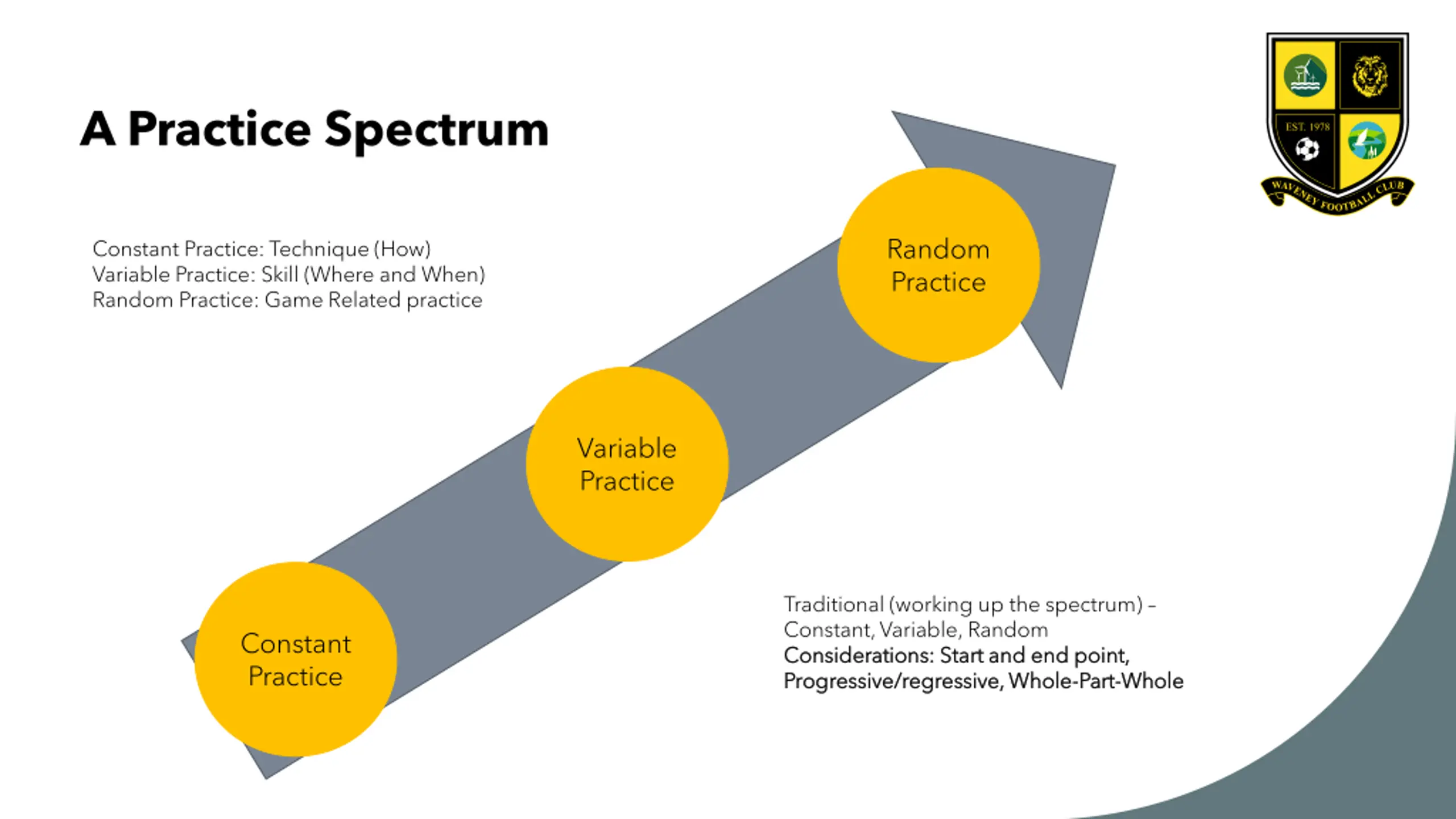 A Practice Spectrum Random Practice Constant Practice: Technique (How) Variable Practice: Skill (Where and When) Random Practice: Game Related practice Variable Practice Traditional (working up the spectrum) Constant, Variable, Random Considerations: Start and end point, Considerations: Start and end point, Progressive/regressive, Whole Progressive/regressive, Whole- -Part Constant Practice Part- -Whole Whole