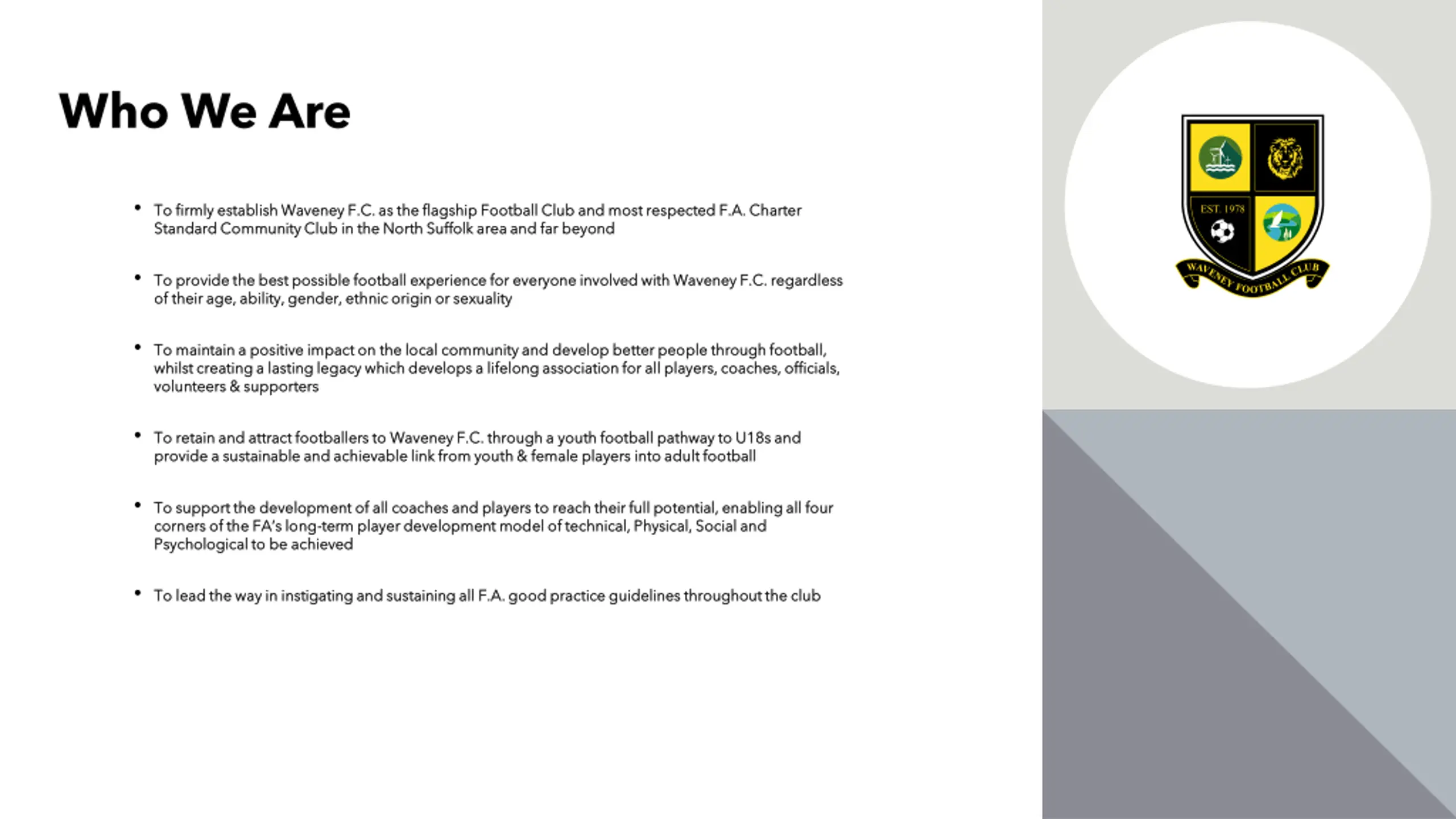 Who We Are To firmly establish Waveney F.C. as the flagship Football Club and most respected F.A. Charter To firmly establish Waveney F.C. as the flagship Football Club and most respected F.A. Charter Standard Community Club in the North Suffolk area and far beyond Standard Community Club in the North Suffolk area and far beyond To provide the best possible football experience for everyone involved with Waveney F.C. regardless To provide the best possible football experience for everyone involved with Waveney F.C. regardless of their age, ability, gender, ethnic origin or sexuality of their age, ability, gender, ethnic origin or sexuality To maintain a positive impact on the local community and develop better people through football, To maintain a positive impact on the local community and develop better people through football, whilst creating a lasting legacy which develops a lifelong association for all players, coaches, officials, whilst creating a lasting legacy which develops a lifelong association for all players, coaches, officials, volunteers & supporters volunteers & supporters To retain and attract footballers to Waveney F.C. through a youth football pathway to U18s and To retain and attract footballers to Waveney F.C. through a youth football pathway to U18s and provide a sustainable and achievable link from youth & female players into adult football provide a sustainable and achievable link from youth & female players into adult football To support the development of all coaches and players to reach their full potential, enabling all four To support the development of all coaches and players to reach their full potential, enabling all four corners of the FA s long corners of the FA s long- -term player development model of technical, Physical, Social and term player development model of technical, Physical, Social and Psychological to be achieved Psychological to be achieved To lead the way in instigating and sustaining all F.A. good practice guidelines throughout the club To lead the way in instigating and sustaining all F.A. good practice guidelines throughout the club