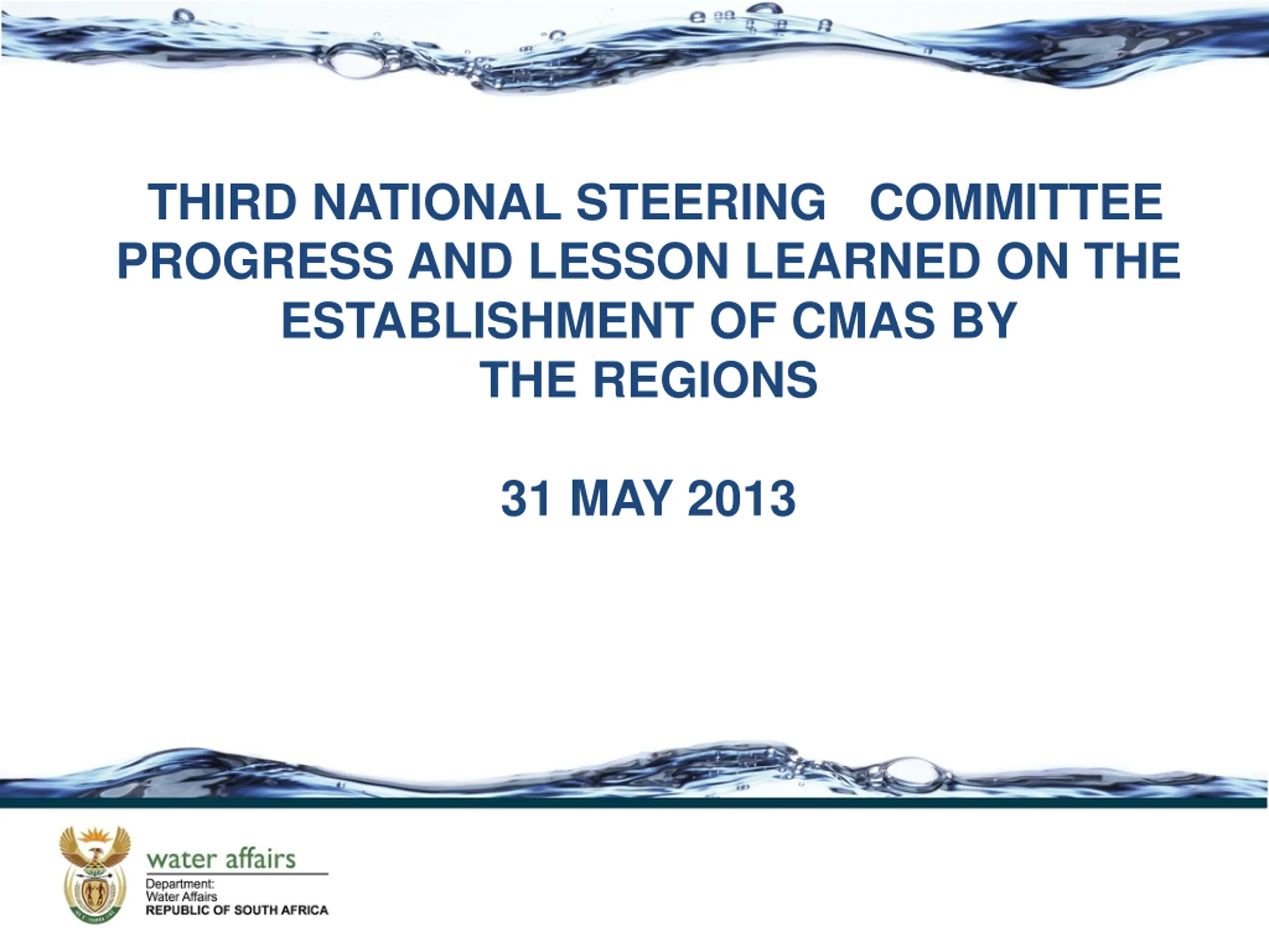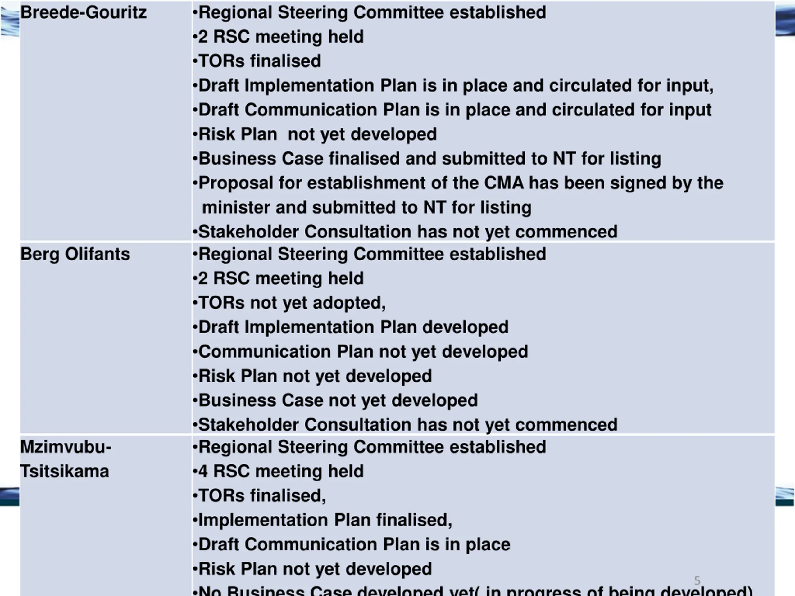 Breede-Gouritz Regional Steering Committee established 2 RSC meeting held TORs finalised Draft Implementation Plan is in place and circulated for input, Draft Communication Plan is in place and circulated for input Risk Plan not yet developed Business Case finalised and submitted to NT for listing Proposal for establishment of the CMA has been signed by the minister and submitted to NT for listing Stakeholder Consultation has not yet commenced Regional Steering Committee established 2 RSC meeting held TORs not yet adopted, Draft Implementation Plan developed Communication Plan not yet developed Risk Plan not yet developed Business Case not yet developed Stakeholder Consultation has not yet commenced Regional Steering Committee established 4 RSC meeting held TORs finalised, Implementation Plan finalised, Draft Communication Plan is in place Risk Plan not yet developed No Business Case developed yet( in progress of being developed) Berg Olifants Mzimvubu- Tsitsikama 5