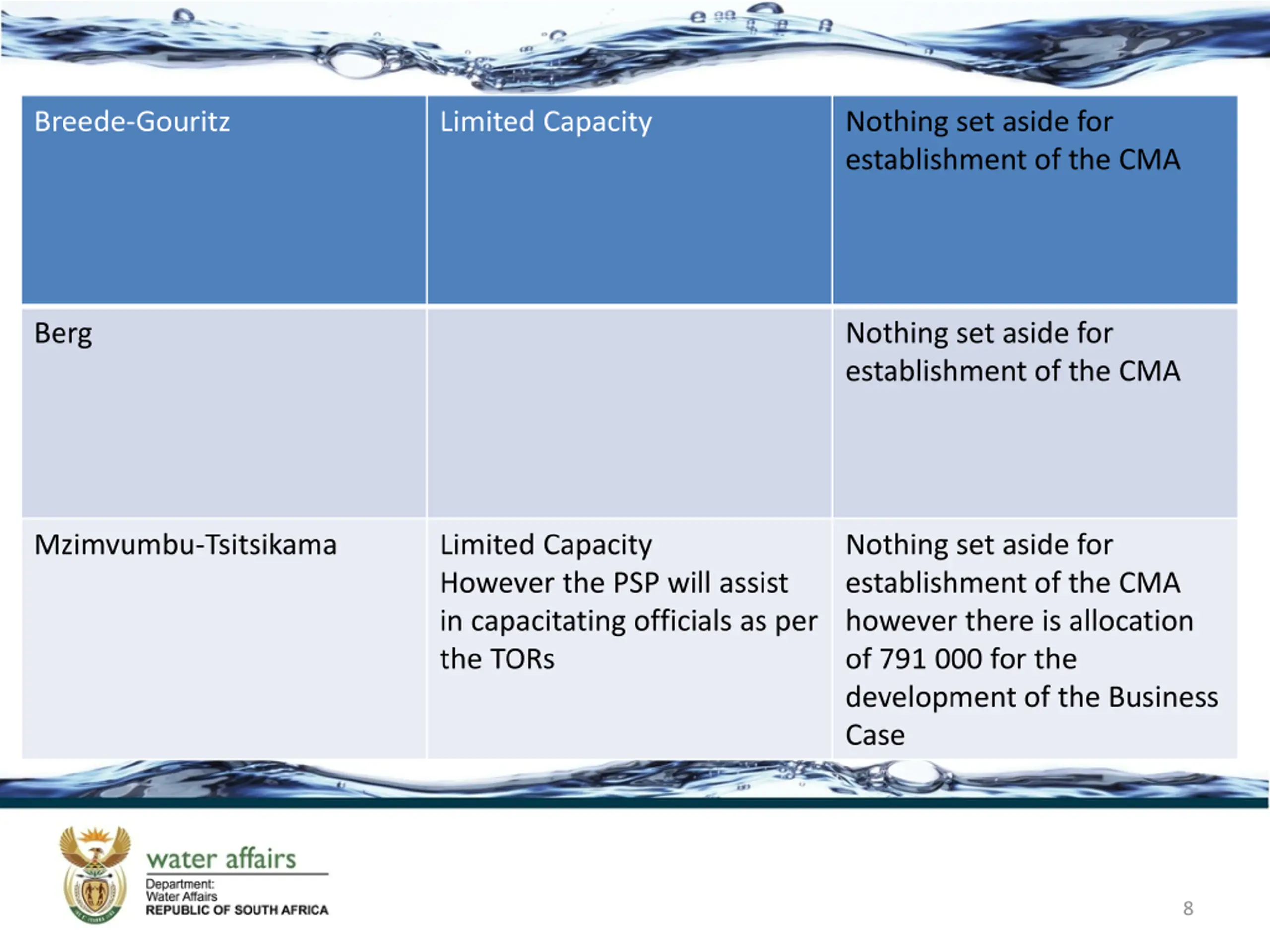 Breede-Gouritz Limited Capacity Nothing set aside for establishment of the CMA Berg Nothing set aside for establishment of the CMA Mzimvumbu-Tsitsikama Limited Capacity However the PSP will assist in capacitating officials as per the TORs Nothing set aside for establishment of the CMA however there is allocation of 791 000 for the development of the Business Case 8
