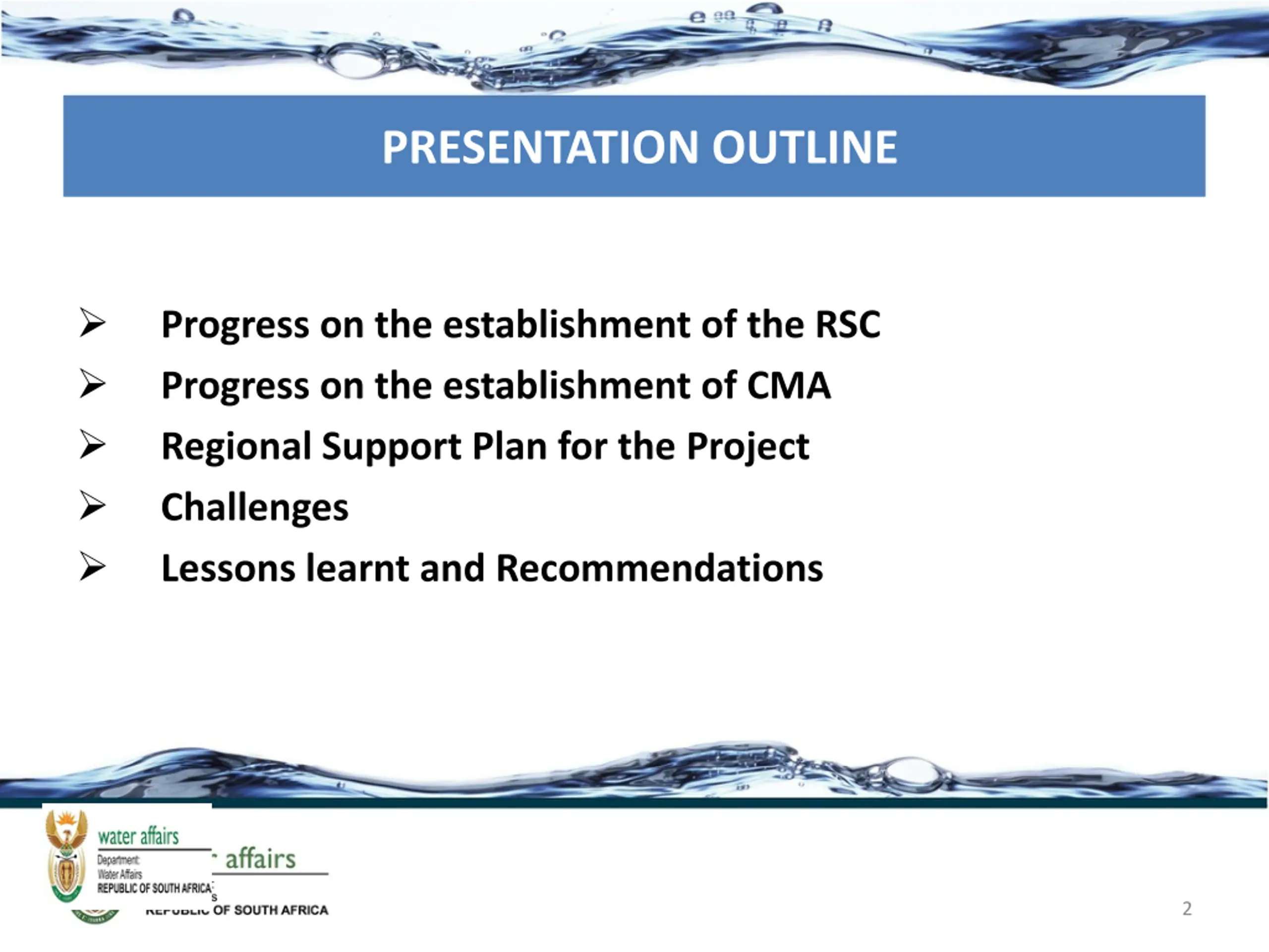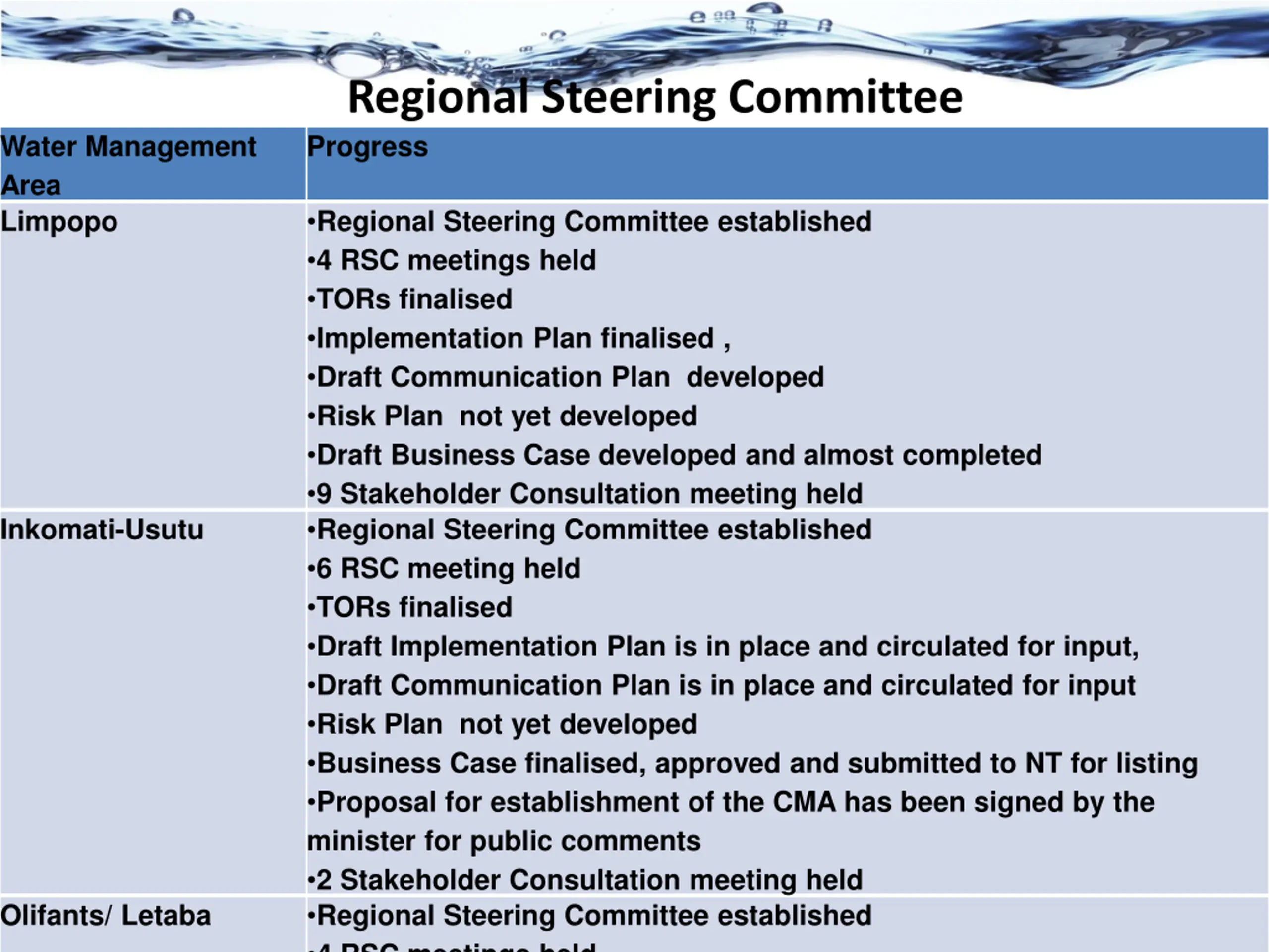 Regional Steering Committee Progress Water Management Area Limpopo Regional Steering Committee established 4 RSC meetings held TORs finalised Implementation Plan finalised , Draft Communication Plan developed Risk Plan not yet developed Draft Business Case developed and almost completed 9 Stakeholder Consultation meeting held Regional Steering Committee established 6 RSC meeting held TORs finalised Draft Implementation Plan is in place and circulated for input, Draft Communication Plan is in place and circulated for input Risk Plan not yet developed Business Case finalised, approved and submitted to NT for listing Proposal for establishment of the CMA has been signed by the minister for public comments 2 Stakeholder Consultation meeting held Regional Steering Committee established 4 RSC meetings held. Inkomati-Usutu Olifants/ Letaba 3