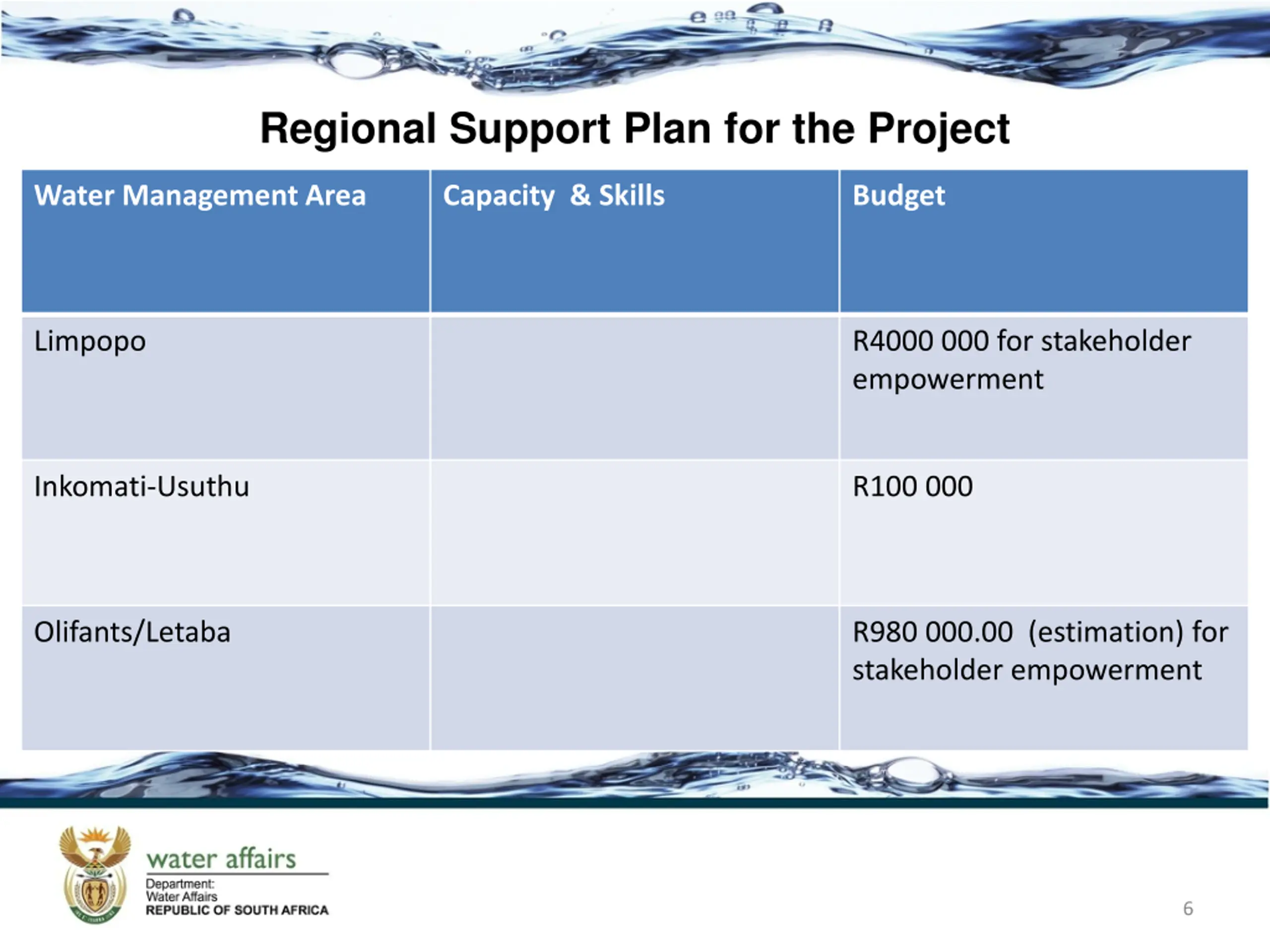 Regional Support Plan for the Project Water Management Area Capacity & Skills Budget Limpopo R4000 000 for stakeholder empowerment Inkomati-Usuthu R100 000 Olifants/Letaba R980 000.00 (estimation) for stakeholder empowerment 6