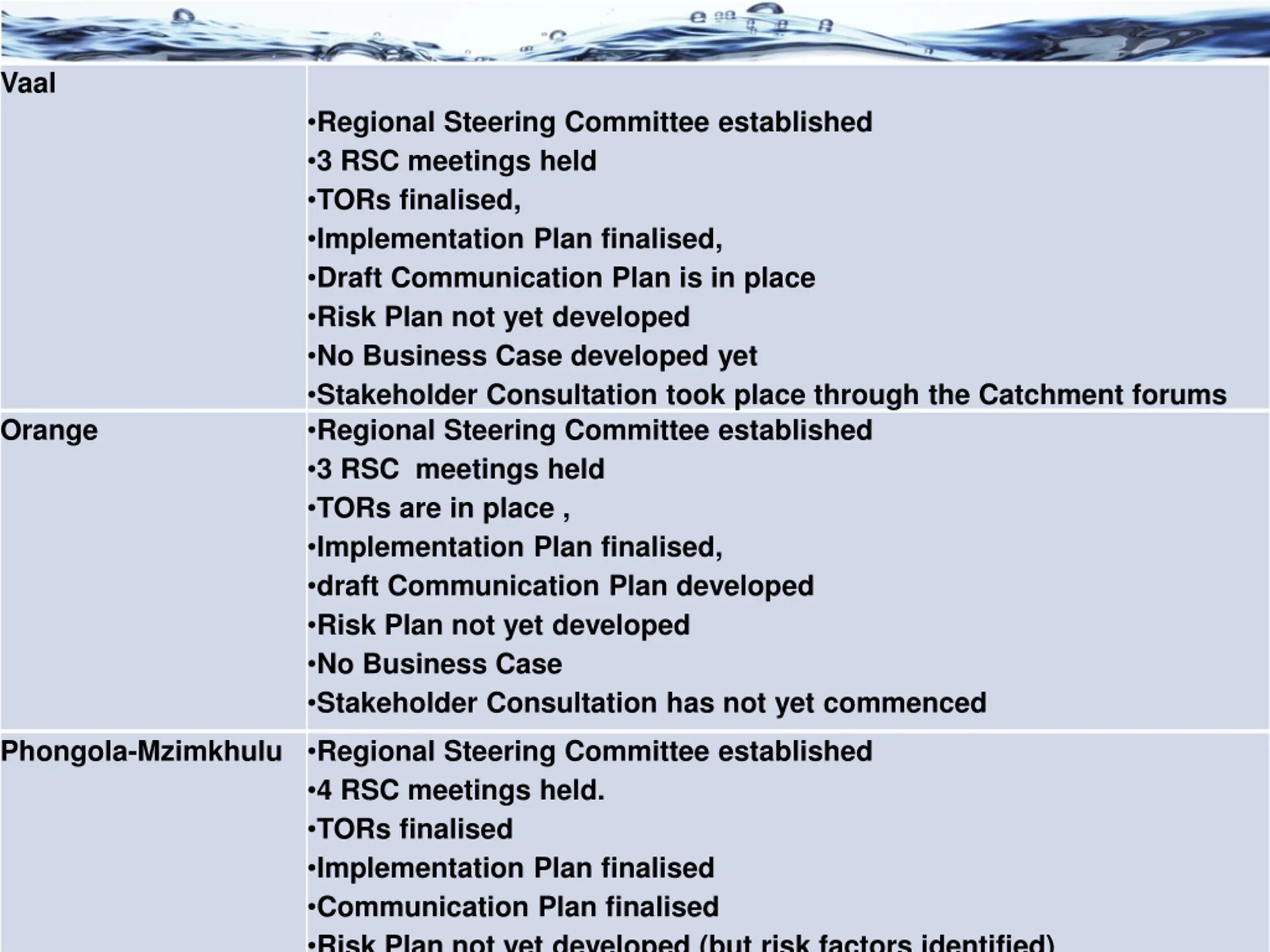Vaal Regional Steering Committee established 3 RSC meetings held TORs finalised, Implementation Plan finalised, Draft Communication Plan is in place Risk Plan not yet developed No Business Case developed yet Stakeholder Consultation took place through the Catchment forums Regional Steering Committee established 3 RSC meetings held TORs are in place , Implementation Plan finalised, draft Communication Plan developed Risk Plan not yet developed No Business Case Stakeholder Consultation has not yet commenced Orange Phongola-Mzimkhulu Regional Steering Committee established 4 RSC meetings held. TORs finalised Implementation Plan finalised Communication Plan finalised Risk Plan not yet developed (but risk factors identified) 4