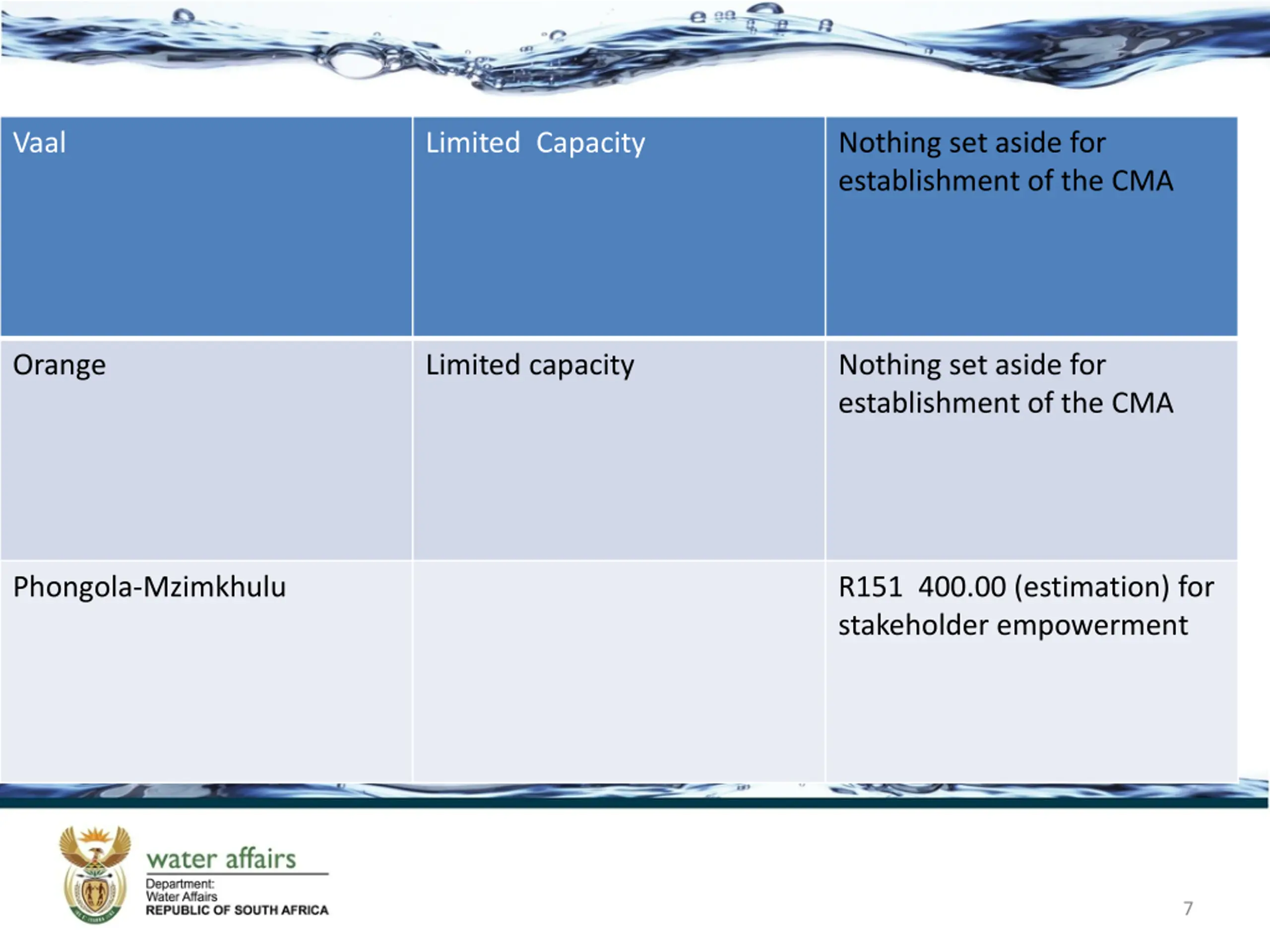 Vaal Limited Capacity Nothing set aside for establishment of the CMA Orange Limited capacity Nothing set aside for establishment of the CMA Phongola-Mzimkhulu R151 400.00 (estimation) for stakeholder empowerment 7