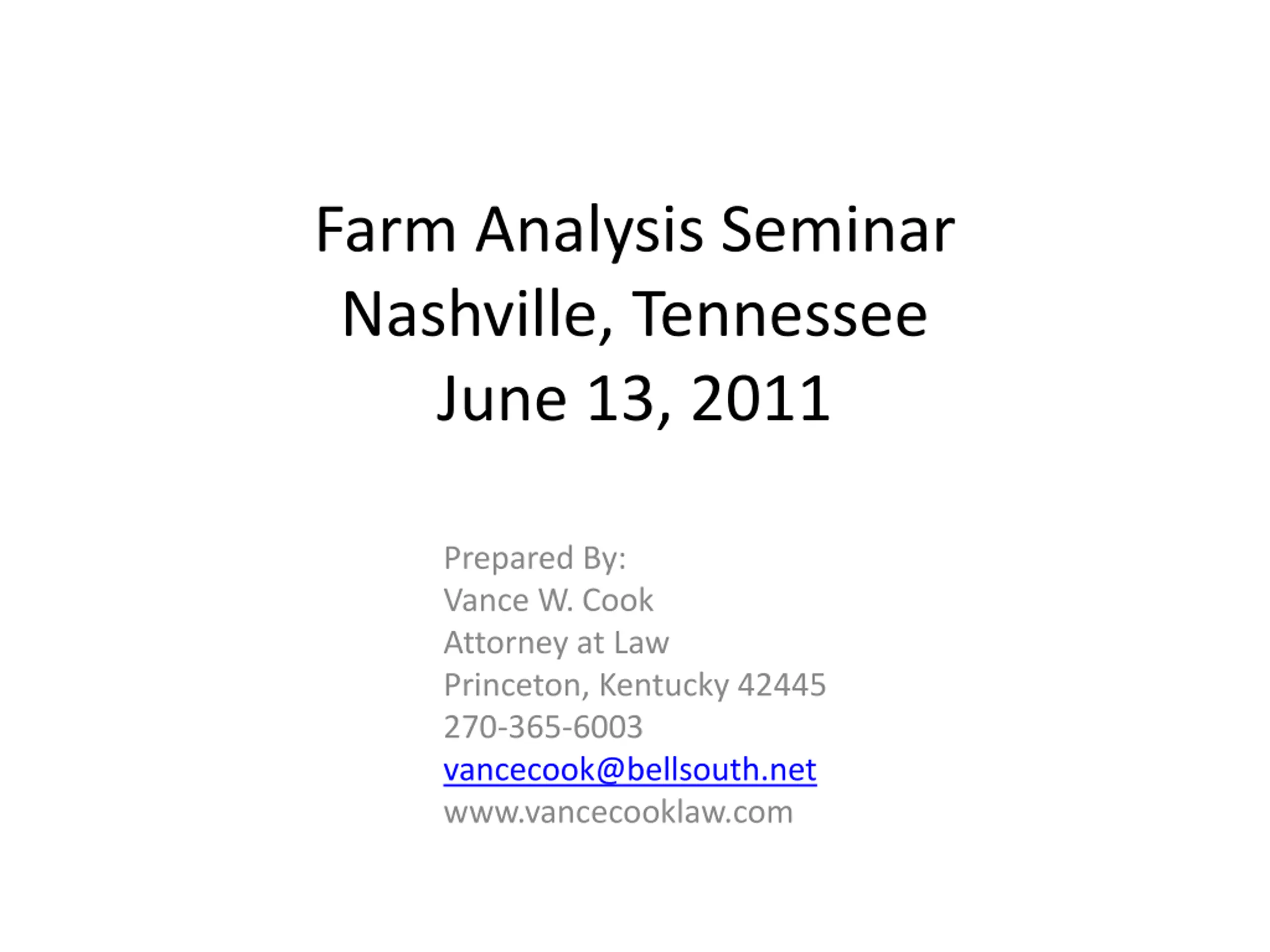 Farm Analysis Seminar Nashville, Tennessee June 13, 2011 Prepared By: Vance W. Cook Attorney at Law Princeton, Kentucky 42445 270-365-6003 vancecook@bellsouth.net www.vancecooklaw.com