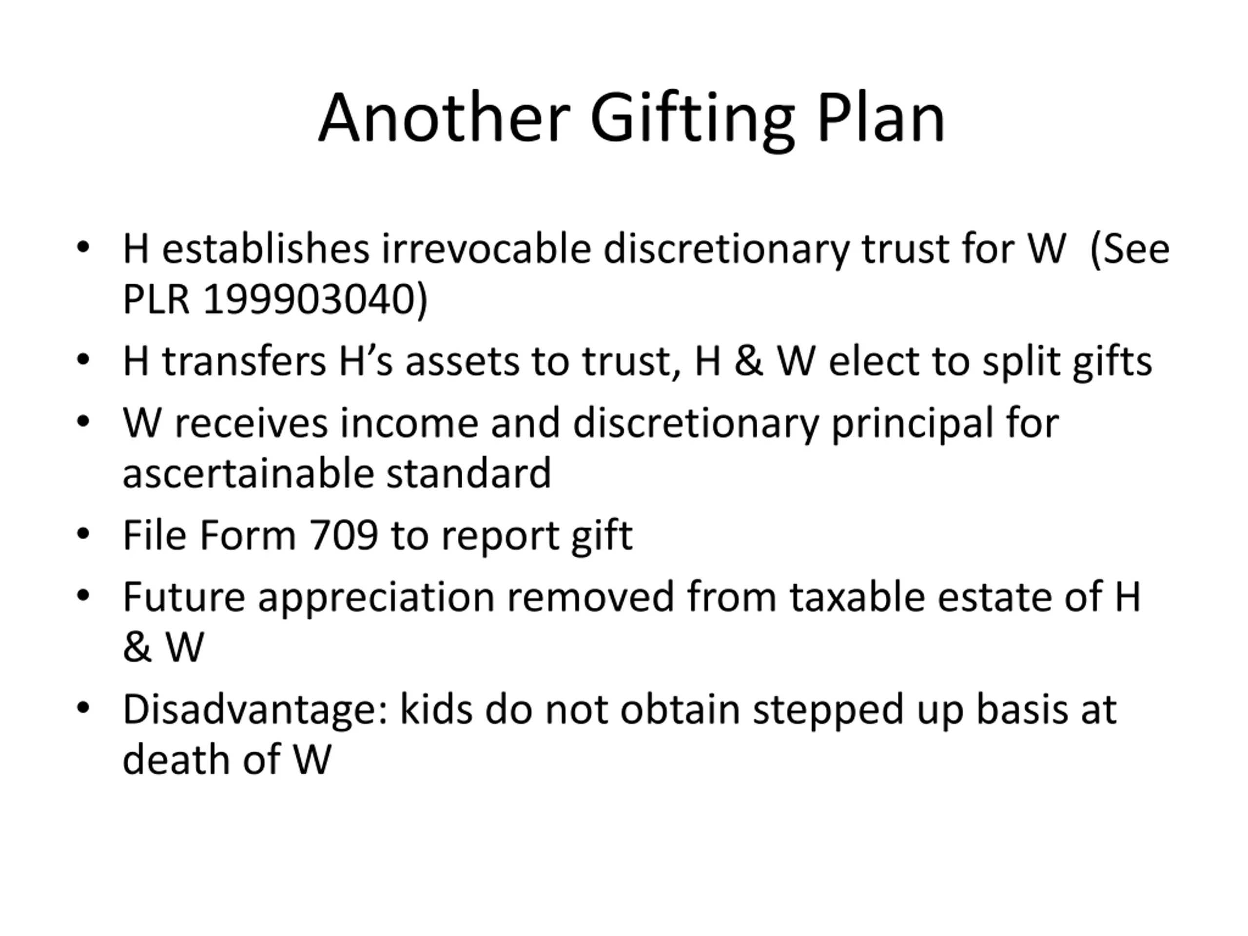 Another Gifting Plan H establishes irrevocable discretionary trust for W (See PLR 199903040) H transfers H s assets to trust, H & W elect to split gifts W receives income and discretionary principal for ascertainable standard File Form 709 to report gift Future appreciation removed from taxable estate of H & W Disadvantage: kids do not obtain stepped up basis at death of W