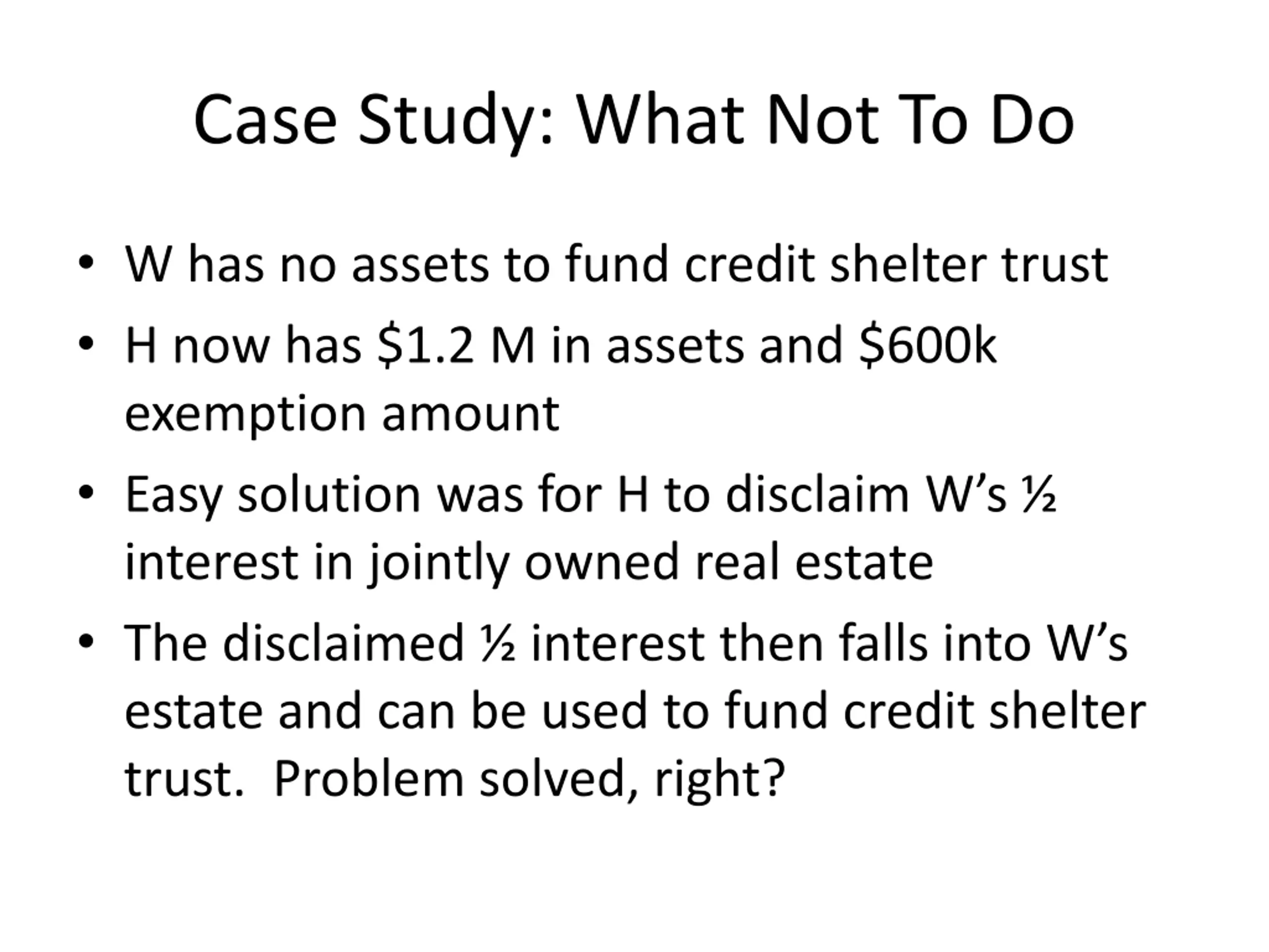 Case Study: What Not To Do W has no assets to fund credit shelter trust H now has $1.2 M in assets and $600k exemption amount Easy solution was for H to disclaim W s interest in jointly owned real estate The disclaimed interest then falls into W s estate and can be used to fund credit shelter trust. Problem solved, right?