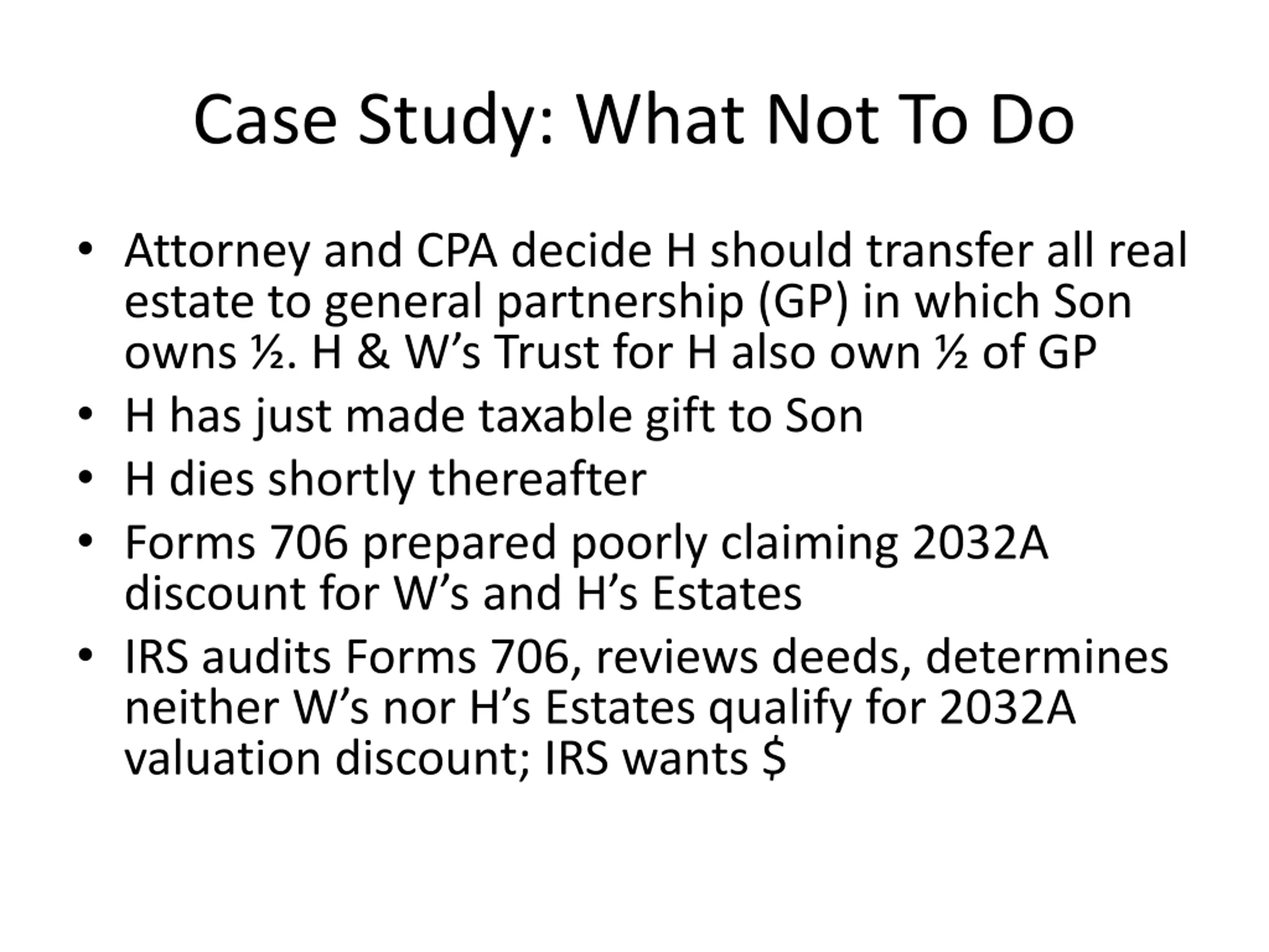 Case Study: What Not To Do Attorney and CPA decide H should transfer all real estate to general partnership (GP) in which Son owns . H & W s Trust for H also own of GP H has just made taxable gift to Son H dies shortly thereafter Forms 706 prepared poorly claiming 2032A discount for W s and H s Estates IRS audits Forms 706, reviews deeds, determines neither W s nor H s Estates qualify for 2032A valuation discount; IRS wants $