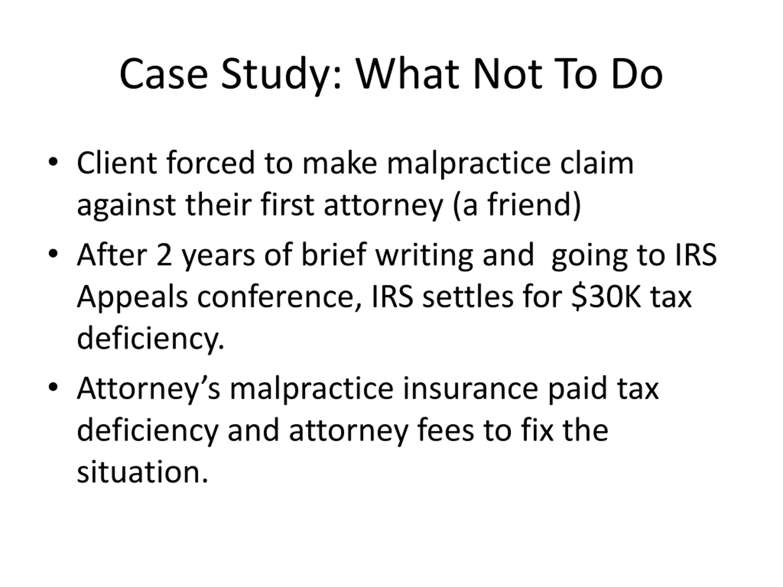 Case Study: What Not To Do Client forced to make malpractice claim against their first attorney (a friend) After 2 years of brief writing and going to IRS Appeals conference, IRS settles for $30K tax deficiency. Attorney s malpractice insurance paid tax deficiency and attorney fees to fix the situation.