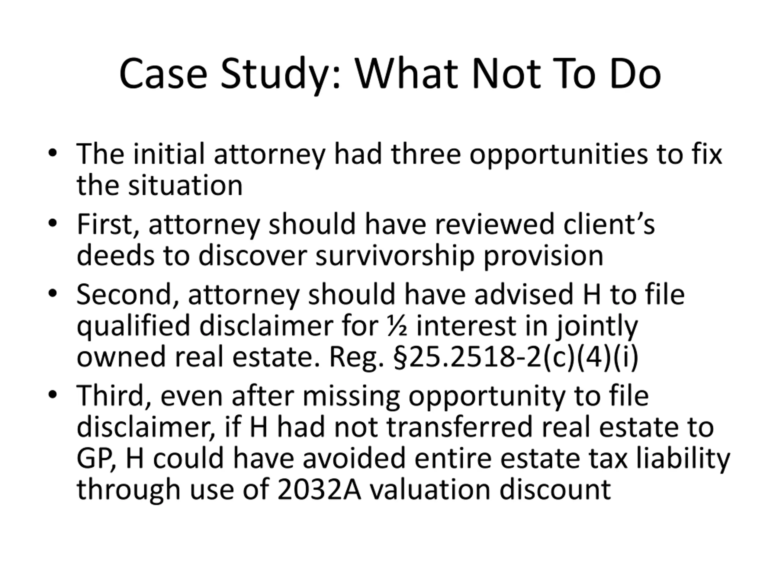Case Study: What Not To Do The initial attorney had three opportunities to fix the situation First, attorney should have reviewed client s deeds to discover survivorship provision Second, attorney should have advised H to file qualified disclaimer for interest in jointly owned real estate. Reg. 25.2518-2(c)(4)(i) Third, even after missing opportunity to file disclaimer, if H had not transferred real estate to GP, H could have avoided entire estate tax liability through use of 2032A valuation discount
