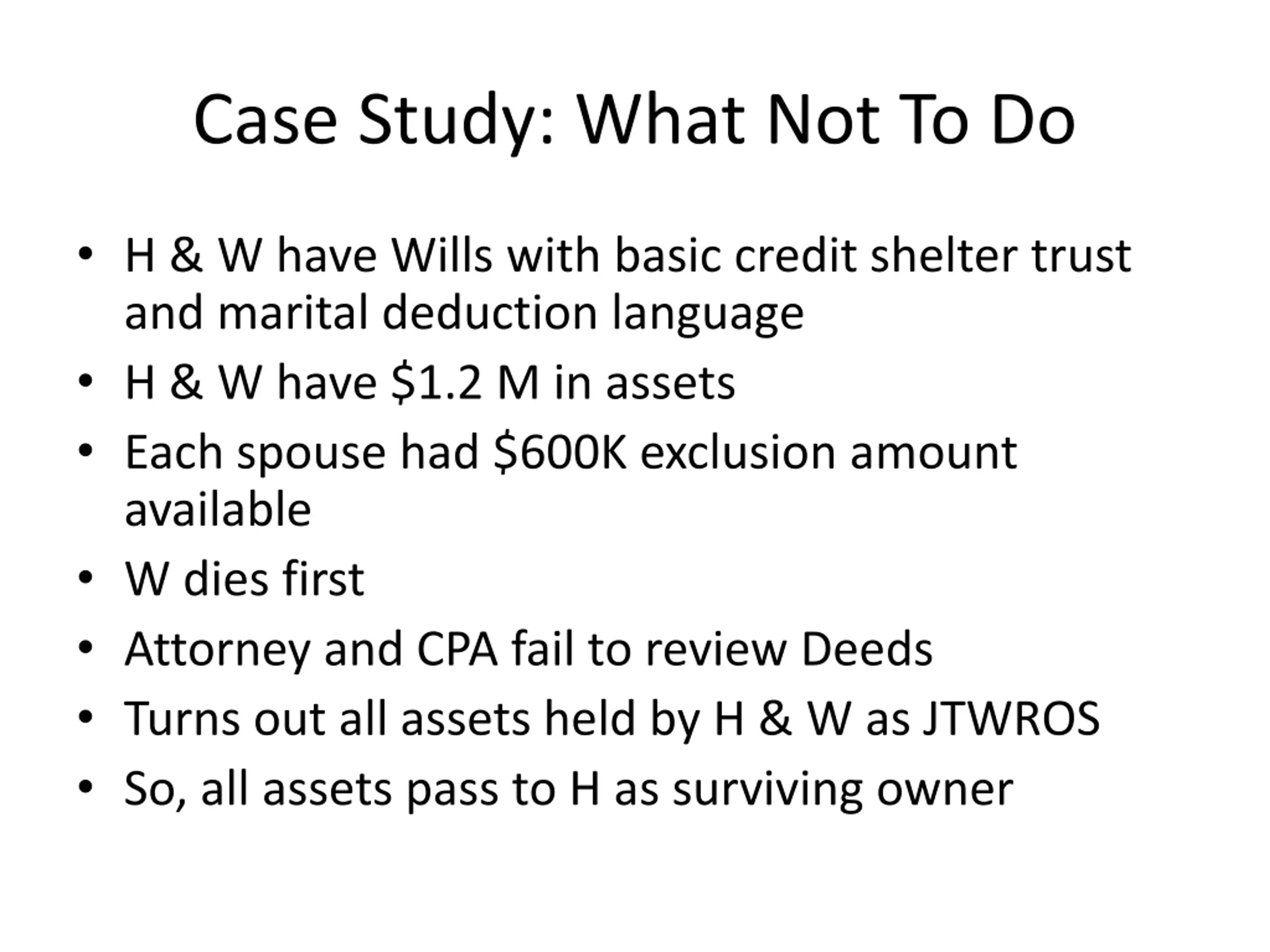 Case Study: What Not To Do H & W have Wills with basic credit shelter trust and marital deduction language H & W have $1.2 M in assets Each spouse had $600K exclusion amount available W dies first Attorney and CPA fail to review Deeds Turns out all assets held by H & W as JTWROS So, all assets pass to H as surviving owner