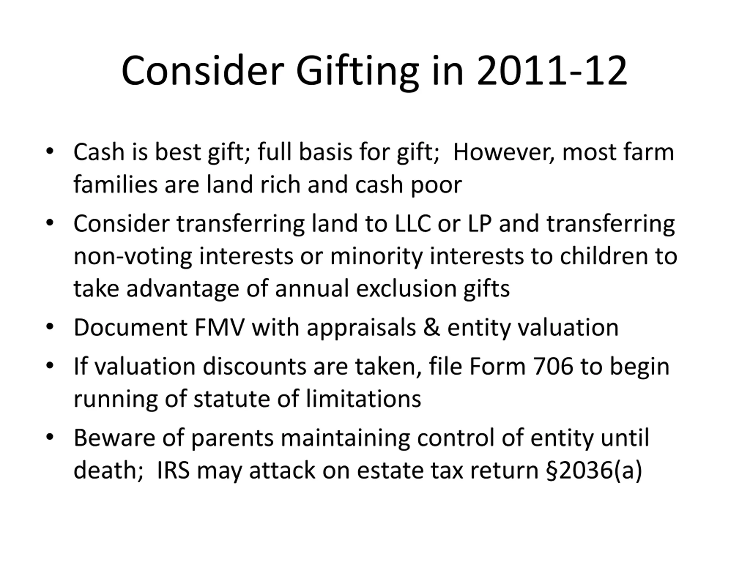 Consider Gifting in 2011-12 Cash is best gift; full basis for gift; However, most farm families are land rich and cash poor Consider transferring land to LLC or LP and transferring non-voting interests or minority interests to children to take advantage of annual exclusion gifts Document FMV with appraisals & entity valuation If valuation discounts are taken, file Form 706 to begin running of statute of limitations Beware of parents maintaining control of entity until death; IRS may attack on estate tax return 2036(a)