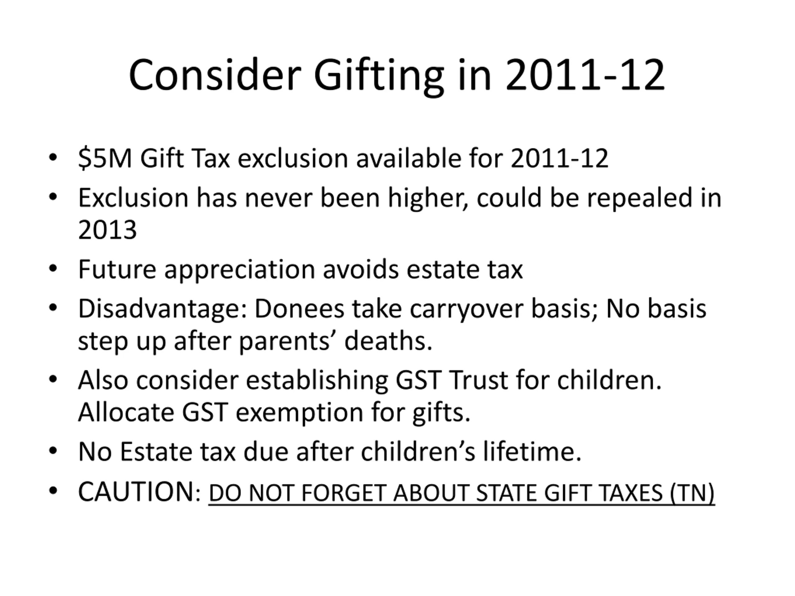 Consider Gifting in 2011-12 $5M Gift Tax exclusion available for 2011-12 Exclusion has never been higher, could be repealed in 2013 Future appreciation avoids estate tax Disadvantage: Donees take carryover basis; No basis step up after parents deaths. Also consider establishing GST Trust for children. Allocate GST exemption for gifts. No Estate tax due after children s lifetime. CAUTION:DO NOT FORGET ABOUT STATE GIFT TAXES (TN)
