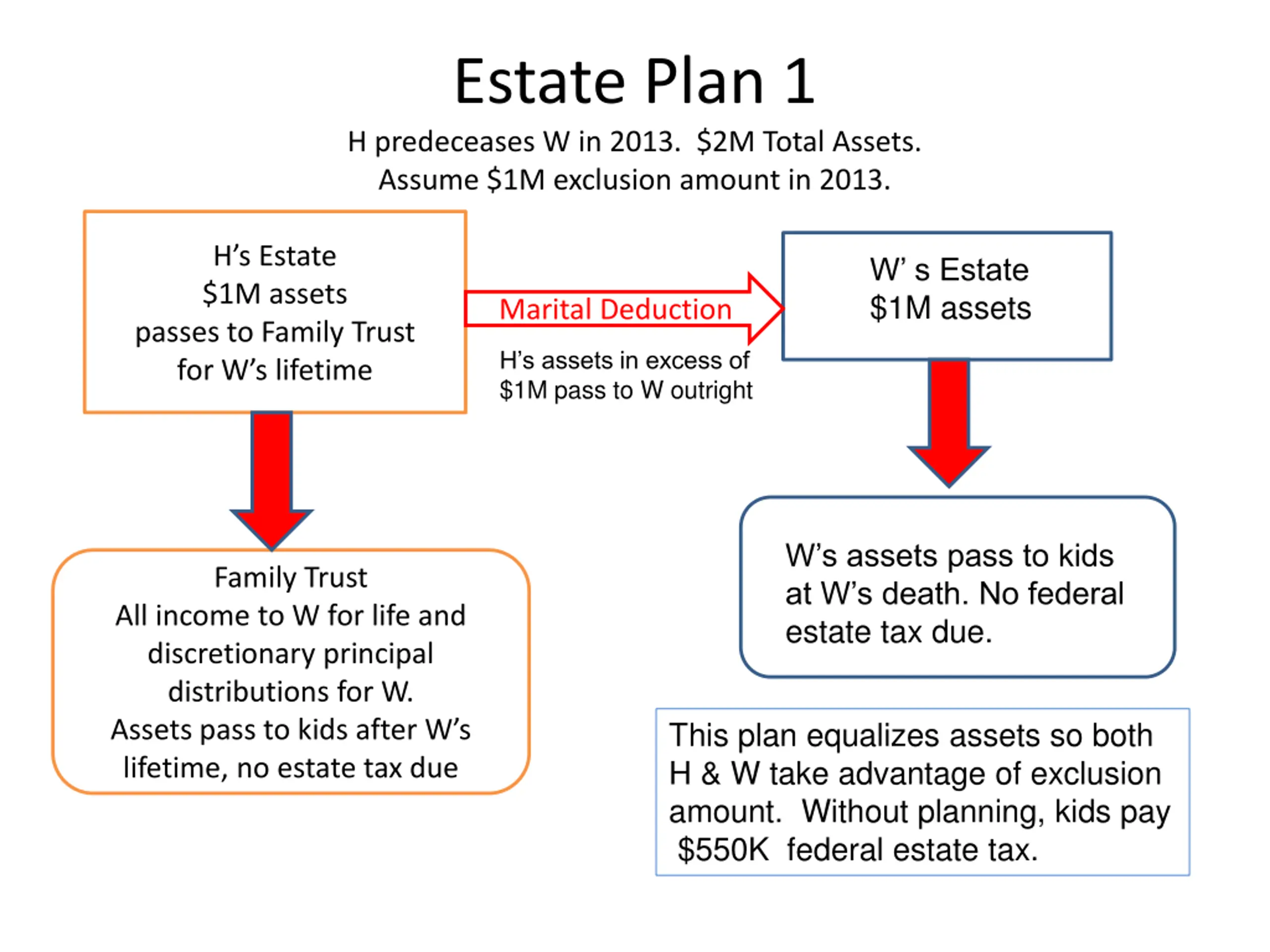 Estate Plan: Exclusion amount in Trust; Excess passes to Spouse as Marital Deduction If combined assets of H & W $2M-$5M: 1) place assets in both spouses names 2) Execute Will/Trust for both spouses to hold exclusion amount upon death of first spouse 3) Surviving Spouse has use of Trust assets for life, but trust assets not included in taxable estate for surviving spouse
