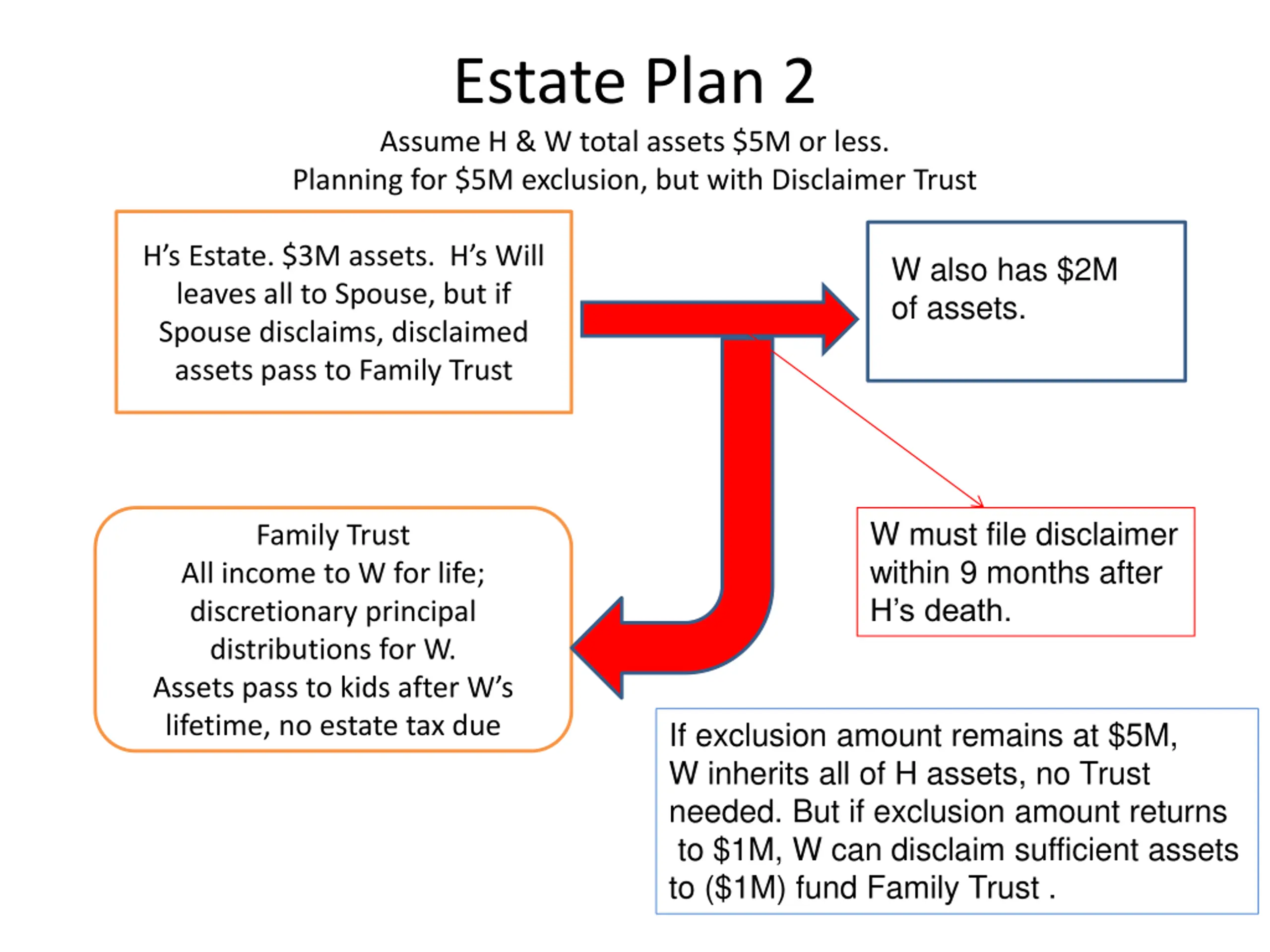 Estate Plan 2 Assume H & W total assets $5M or less. Planning for $5M exclusion, but with Disclaimer Trust H s Estate. $3M assets. H s Will leaves all to Spouse, but if Spouse disclaims, disclaimed assets pass to Family Trust W also has $2M of assets. W must file disclaimer within 9 months after H s death. Family Trust All income to W for life; discretionary principal distributions for W. Assets pass to kids after W s lifetime, no estate tax due If exclusion amount remains at $5M, W inherits all of H assets, no Trust needed. But if exclusion amount returns to $1M, W can disclaim sufficient assets to ($1M) fund Family Trust .
