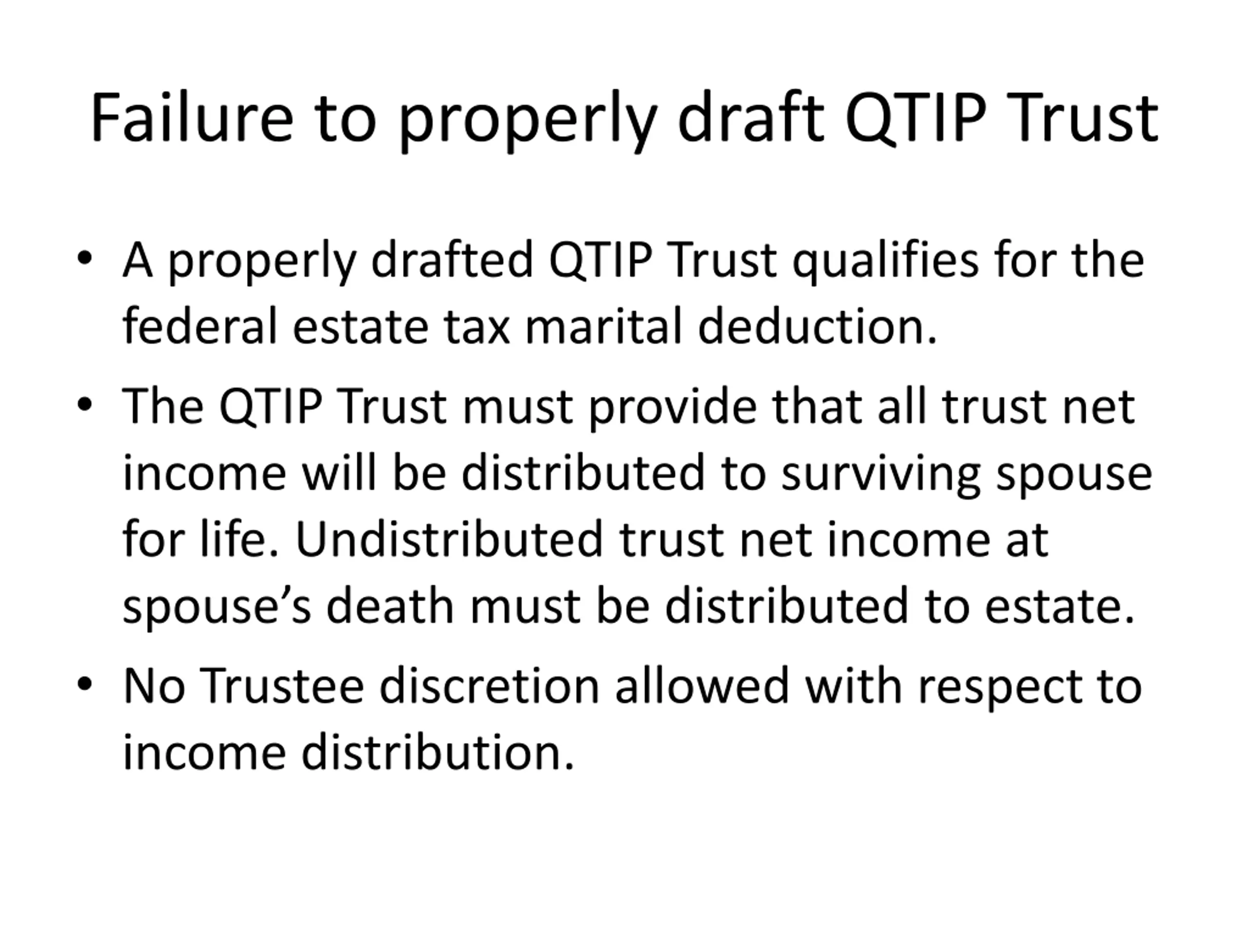 Failure to properly draft QTIP Trust A properly drafted QTIP Trust qualifies for the federal estate tax marital deduction. The QTIP Trust must provide that all trust net income will be distributed to surviving spouse for life. Undistributed trust net income at spouse s death must be distributed to estate. No Trustee discretion allowed with respect to income distribution.