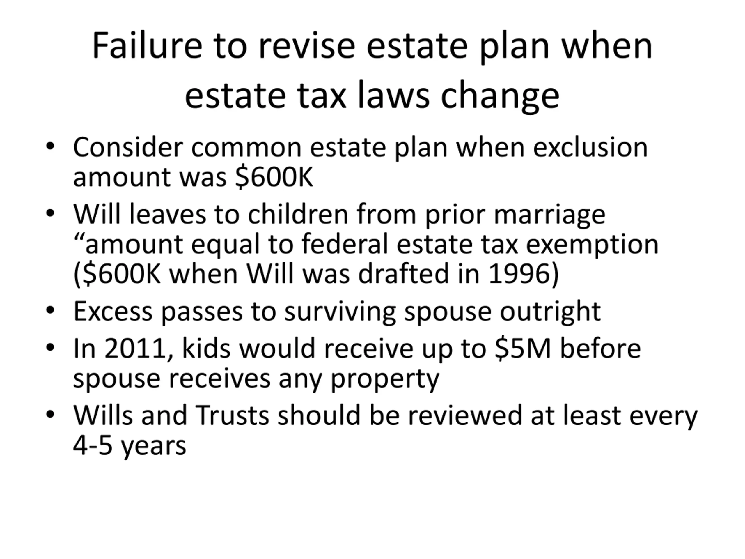 Failure to revise estate plan when estate tax laws change Consider common estate plan when exclusion amount was $600K Will leaves to children from prior marriage amount equal to federal estate tax exemption ($600K when Will was drafted in 1996) Excess passes to surviving spouse outright In 2011, kids would receive up to $5M before spouse receives any property Wills and Trusts should be reviewed at least every 4-5 years