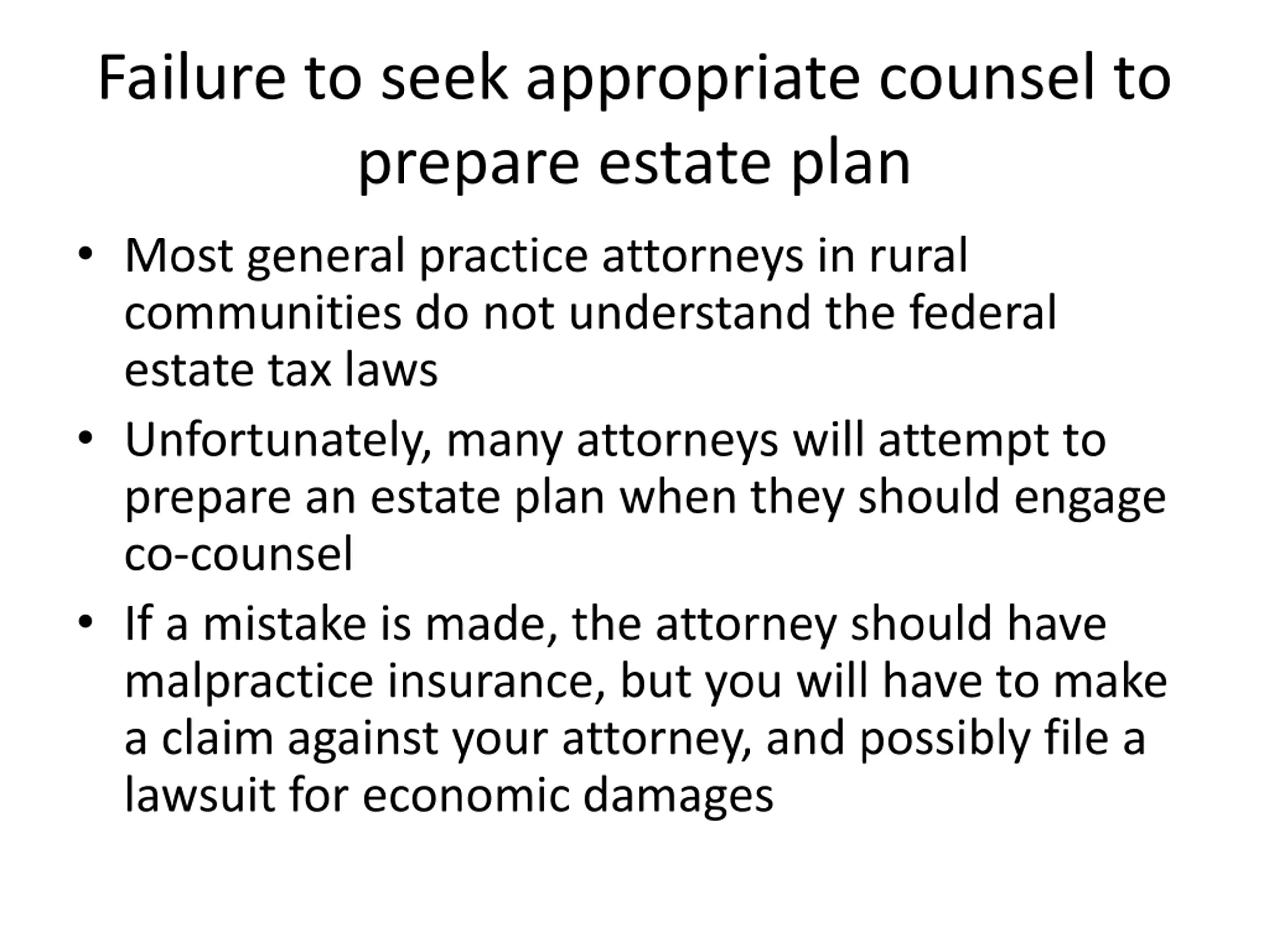 Failure to seek appropriate counsel to prepare estate plan Most general practice attorneys in rural communities do not understand the federal estate tax laws Unfortunately, many attorneys will attempt to prepare an estate plan when they should engage co-counsel If a mistake is made, the attorney should have malpractice insurance, but you will have to make a claim against your attorney, and possibly file a lawsuit for economic damages
