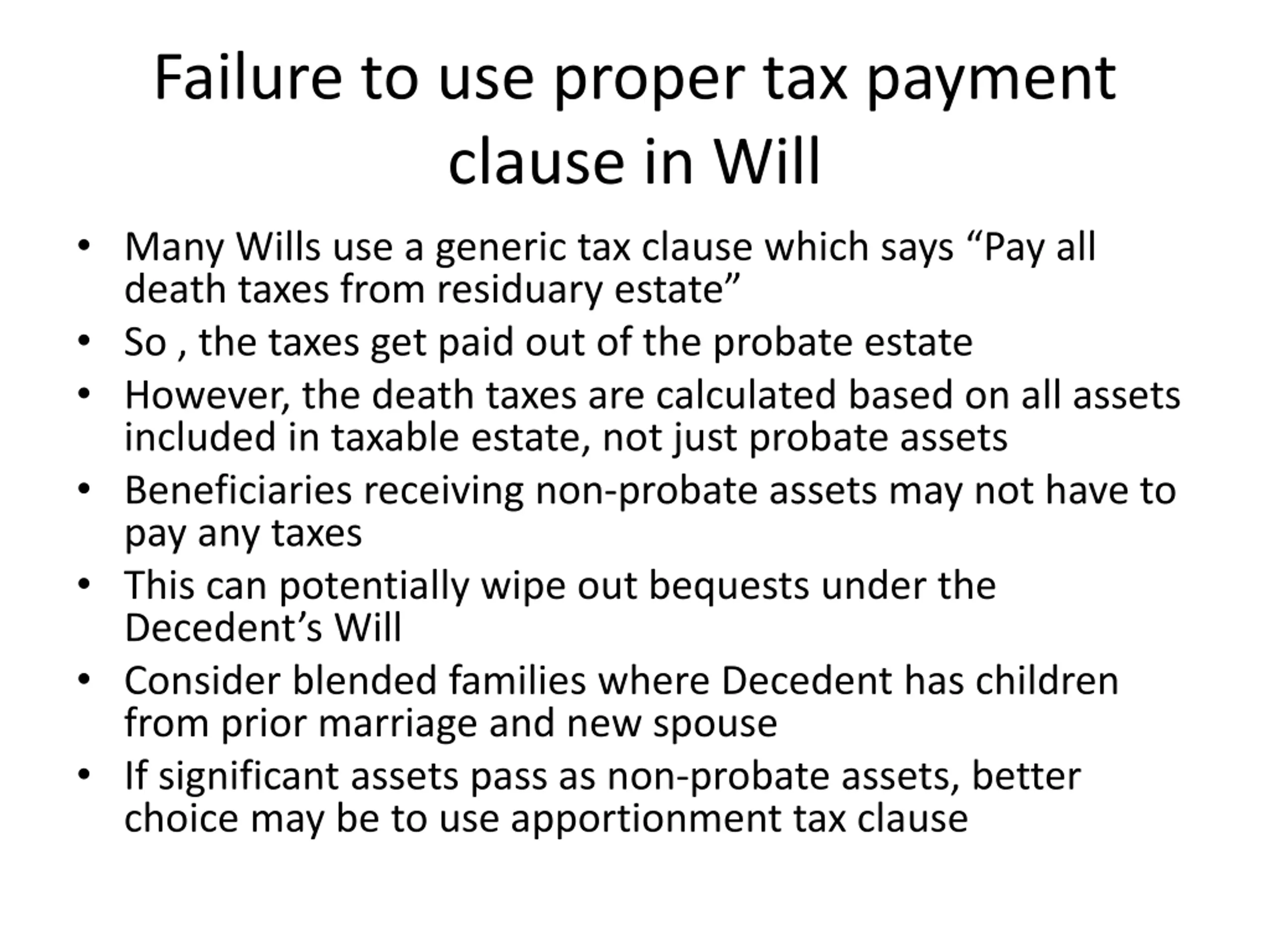 Failure to use proper tax payment clause in Will Many Wills use a generic tax clause which says Pay all death taxes from residuary estate So , the taxes get paid out of the probate estate However, the death taxes are calculated based on all assets included in taxable estate, not just probate assets Beneficiaries receiving non-probate assets may not have to pay any taxes This can potentially wipe out bequests under the Decedent s Will Consider blended families where Decedent has children from prior marriage and new spouse If significant assets pass as non-probate assets, better choice may be to use apportionment tax clause