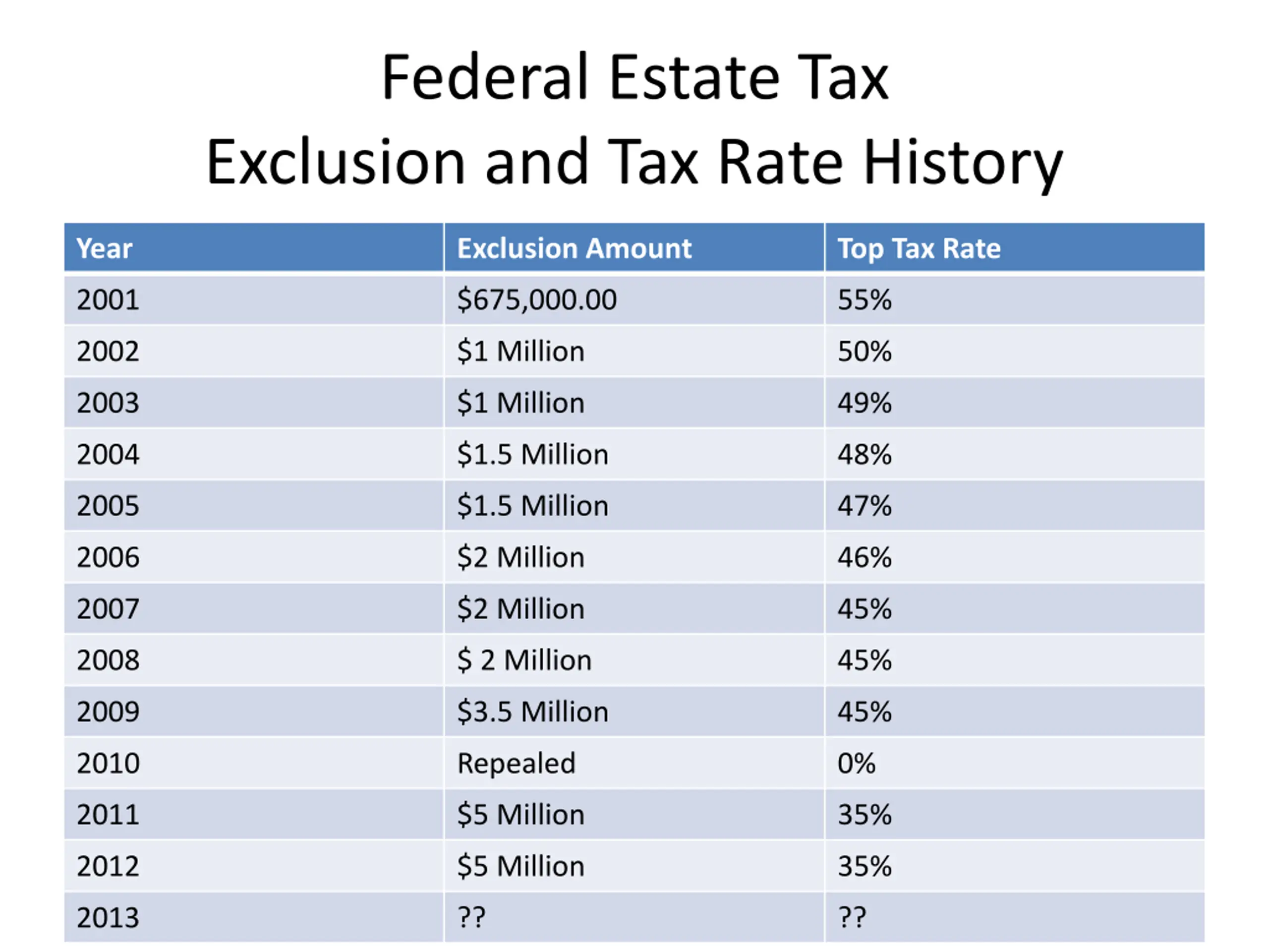 Federal Estate Tax Exclusion and Tax Rate History Year Exclusion Amount Top Tax Rate 2001 $675,000.00 55% 2002 $1 Million 50% 2003 $1 Million 49% 2004 $1.5 Million 48% 2005 $1.5 Million 47% 2006 $2 Million 46% 2007 $2 Million 45% 2008 $ 2 Million 45% 2009 $3.5 Million 45% 2010 Repealed 0% 2011 $5 Million 35% 2012 $5 Million 35% 2013 ?? ??