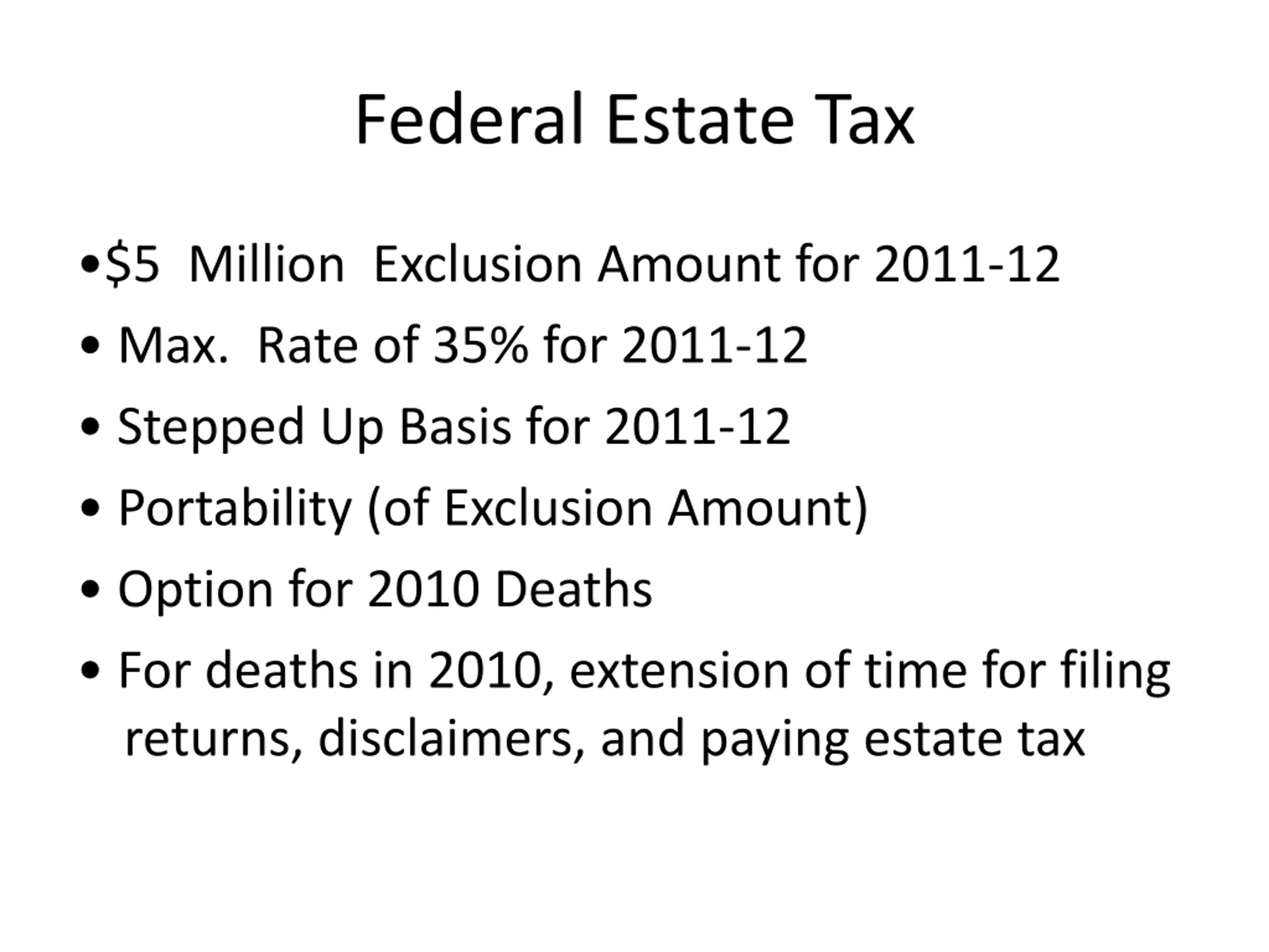 Federal Estate Tax $5 Million Exclusion Amount for 2011-12 Max. Rate of 35% for 2011-12 Stepped Up Basis for 2011-12 Portability (of Exclusion Amount) Option for 2010 Deaths For deaths in 2010, extension of time for filing returns, disclaimers, and paying estate tax