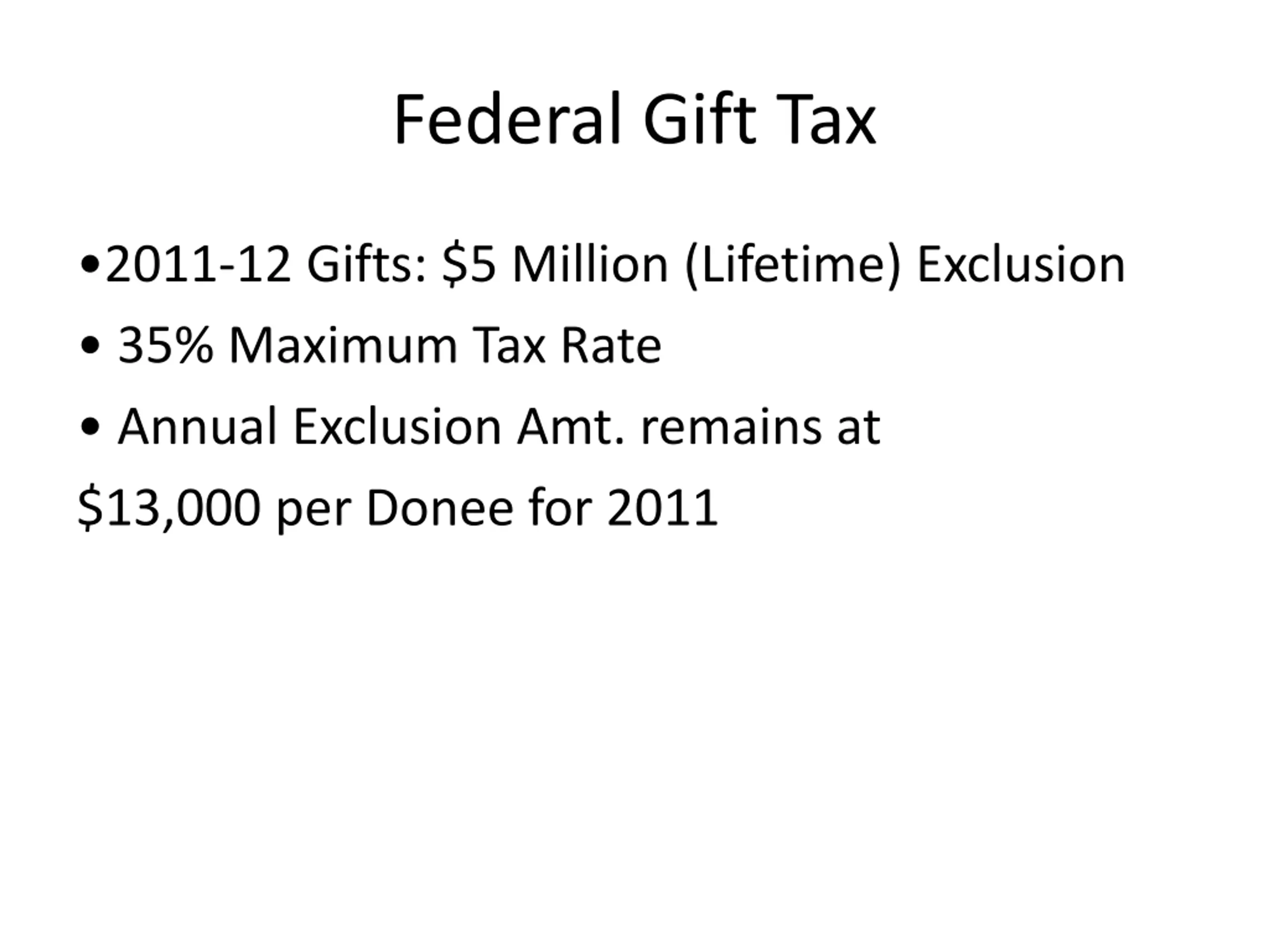 Federal Gift Tax 2011-12 Gifts: $5 Million (Lifetime) Exclusion 35% Maximum Tax Rate Annual Exclusion Amt. remains at $13,000 per Donee for 2011