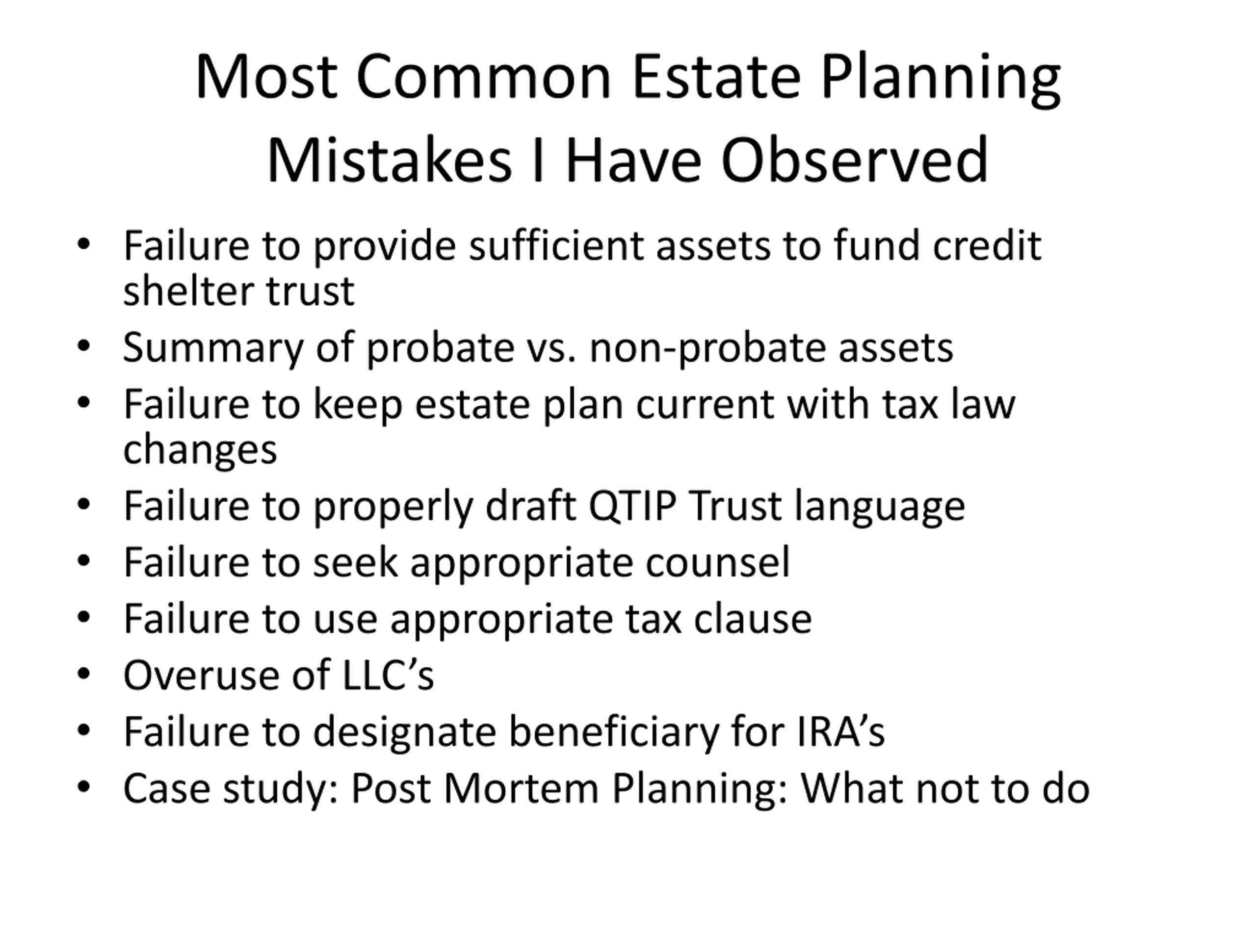 Most Common Estate Planning Mistakes I Have Observed Failure to provide sufficient assets to fund credit shelter trust Summary of probate vs. non-probate assets Failure to keep estate plan current with tax law changes Failure to properly draft QTIP Trust language Failure to seek appropriate counsel Failure to use appropriate tax clause Overuse of LLC s Failure to designate beneficiary for IRA s Case study: Post Mortem Planning: What not to do
