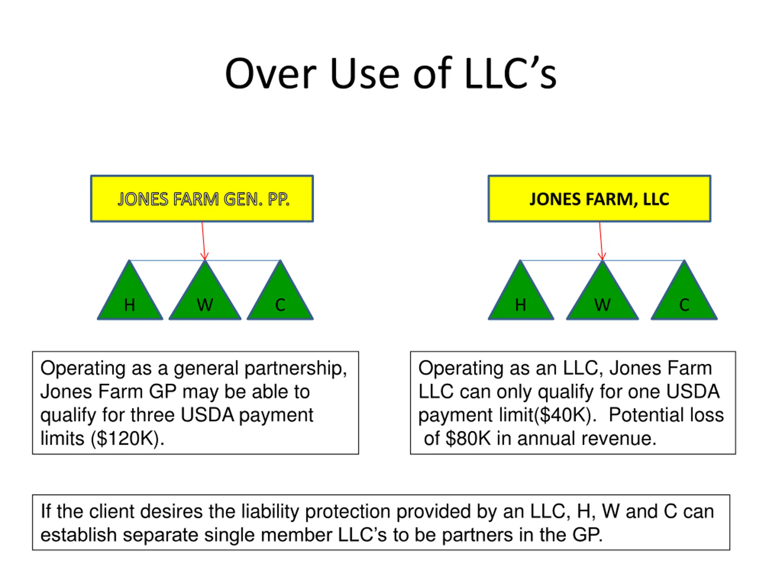 Over Use of LLCs JONES FARM GEN. PP. JONES FARM, LLC H W C H W C Operating as a general partnership, Jones Farm GP may be able to qualify for three USDA payment limits ($120K). Operating as an LLC, Jones Farm LLC can only qualify for one USDA payment limit($40K). Potential loss of $80K in annual revenue. If the client desires the liability protection provided by an LLC, H, W and C can establish separate single member LLC s to be partners in the GP.