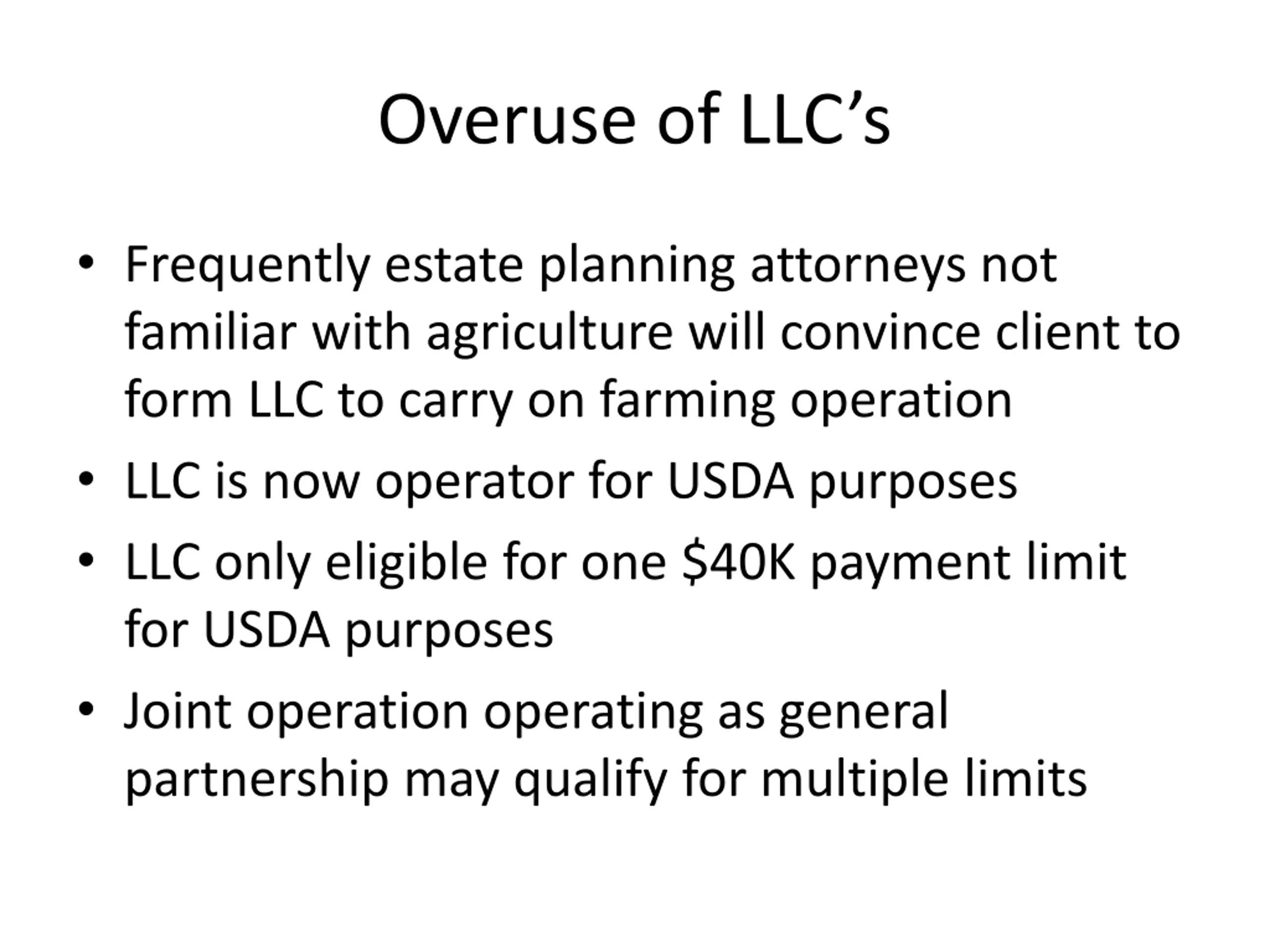 Overuse of LLCs Frequently estate planning attorneys not familiar with agriculture will convince client to form LLC to carry on farming operation LLC is now operator for USDA purposes LLC only eligible for one $40K payment limit for USDA purposes Joint operation operating as general partnership may qualify for multiple limits