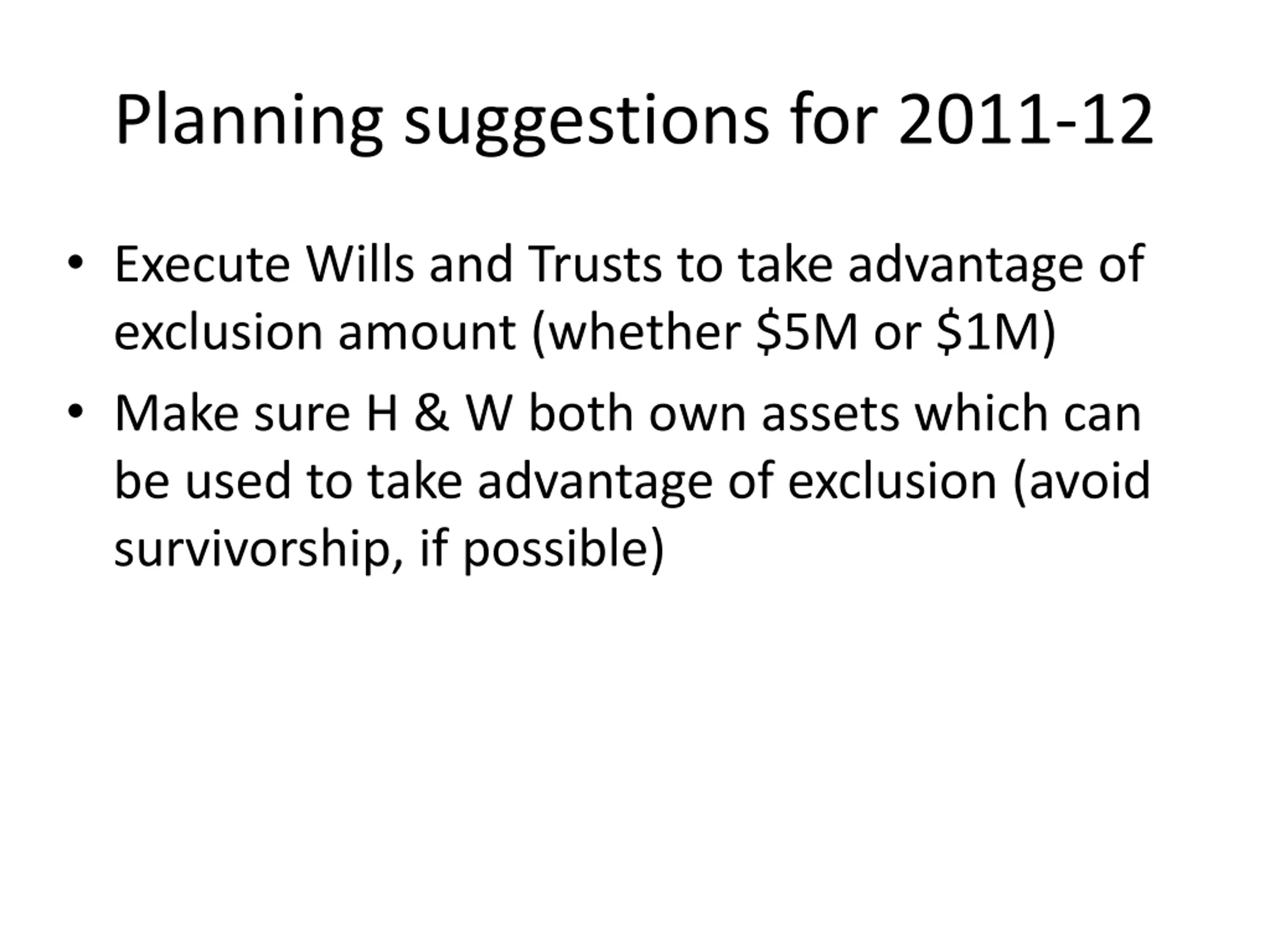 Planning suggestions for 2011-12 Execute Wills and Trusts to take advantage of exclusion amount (whether $5M or $1M) Make sure H & W both own assets which can be used to take advantage of exclusion (avoid survivorship, if possible)
