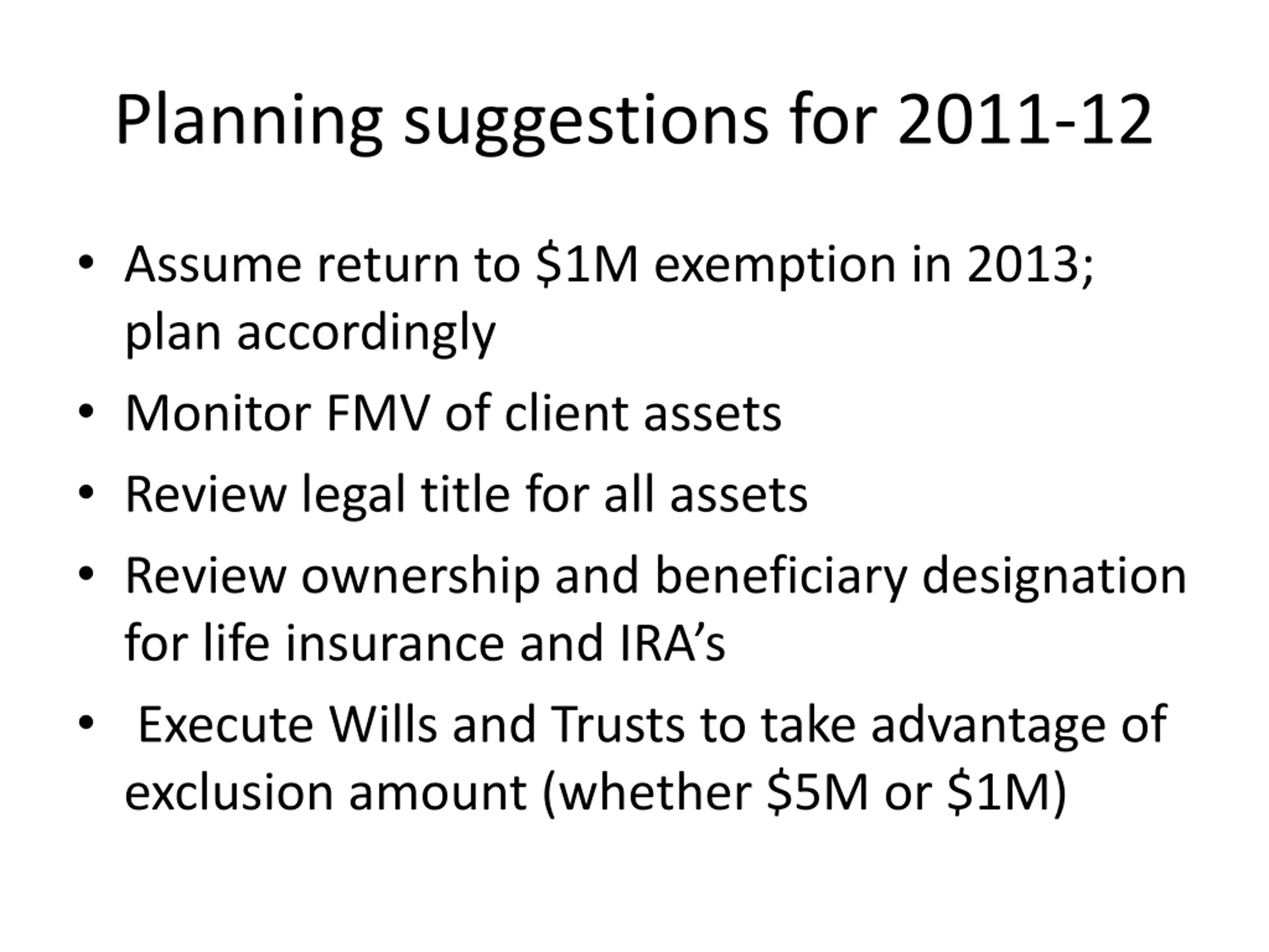 Planning suggestions for 2011-12 Assume return to $1M exemption in 2013; plan accordingly Monitor FMV of client assets Review legal title for all assets Review ownership and beneficiary designation for life insurance and IRA s Execute Wills and Trusts to take advantage of exclusion amount (whether $5M or $1M)