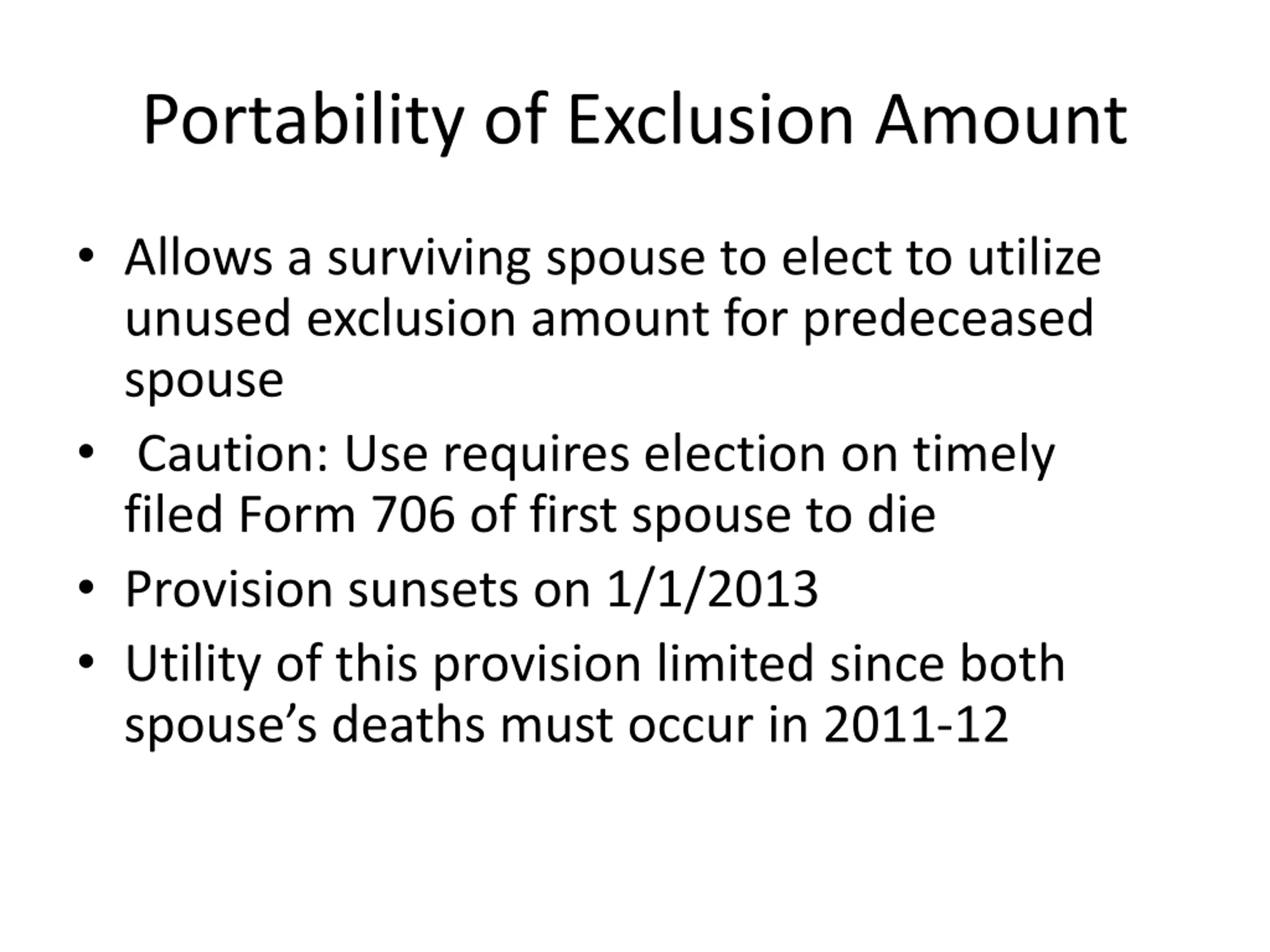 Portability of Exclusion Amount Allows a surviving spouse to elect to utilize unused exclusion amount for predeceased spouse Caution: Use requires election on timely filed Form 706 of first spouse to die Provision sunsets on 1/1/2013 Utility of this provision limited since both spouse s deaths must occur in 2011-12
