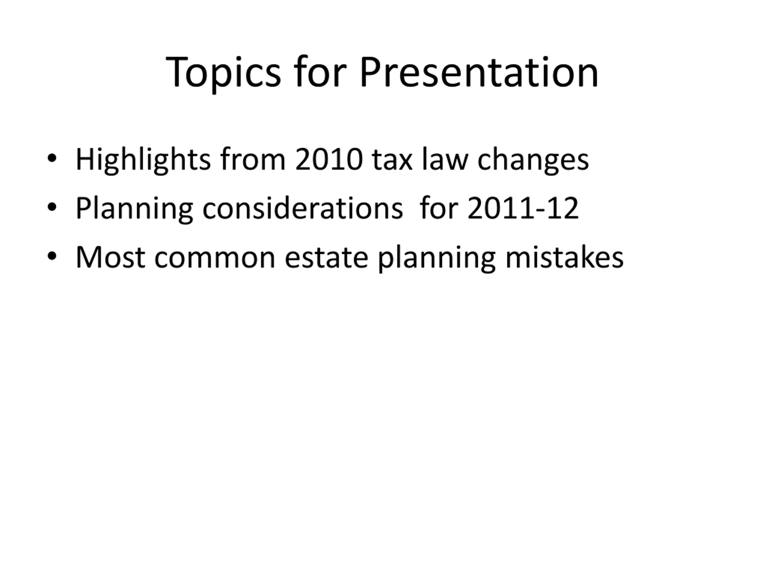 Topics for Presentation Highlights from 2010 tax law changes Planning considerations for 2011-12 Most common estate planning mistakes