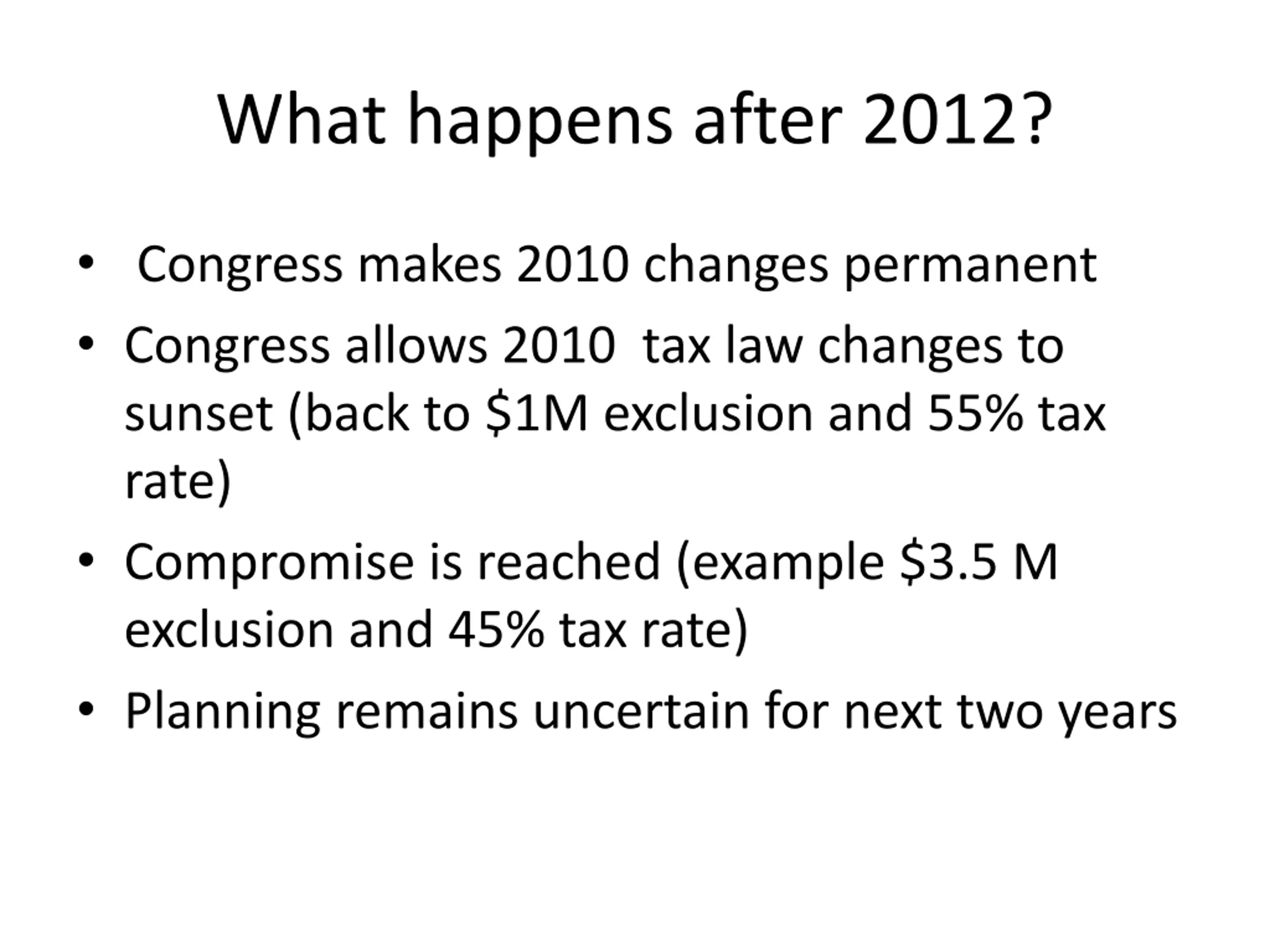 What happens after 2012? Congress makes 2010 changes permanent Congress allows 2010 tax law changes to sunset (back to $1M exclusion and 55% tax rate) Compromise is reached (example $3.5 M exclusion and 45% tax rate) Planning remains uncertain for next two years