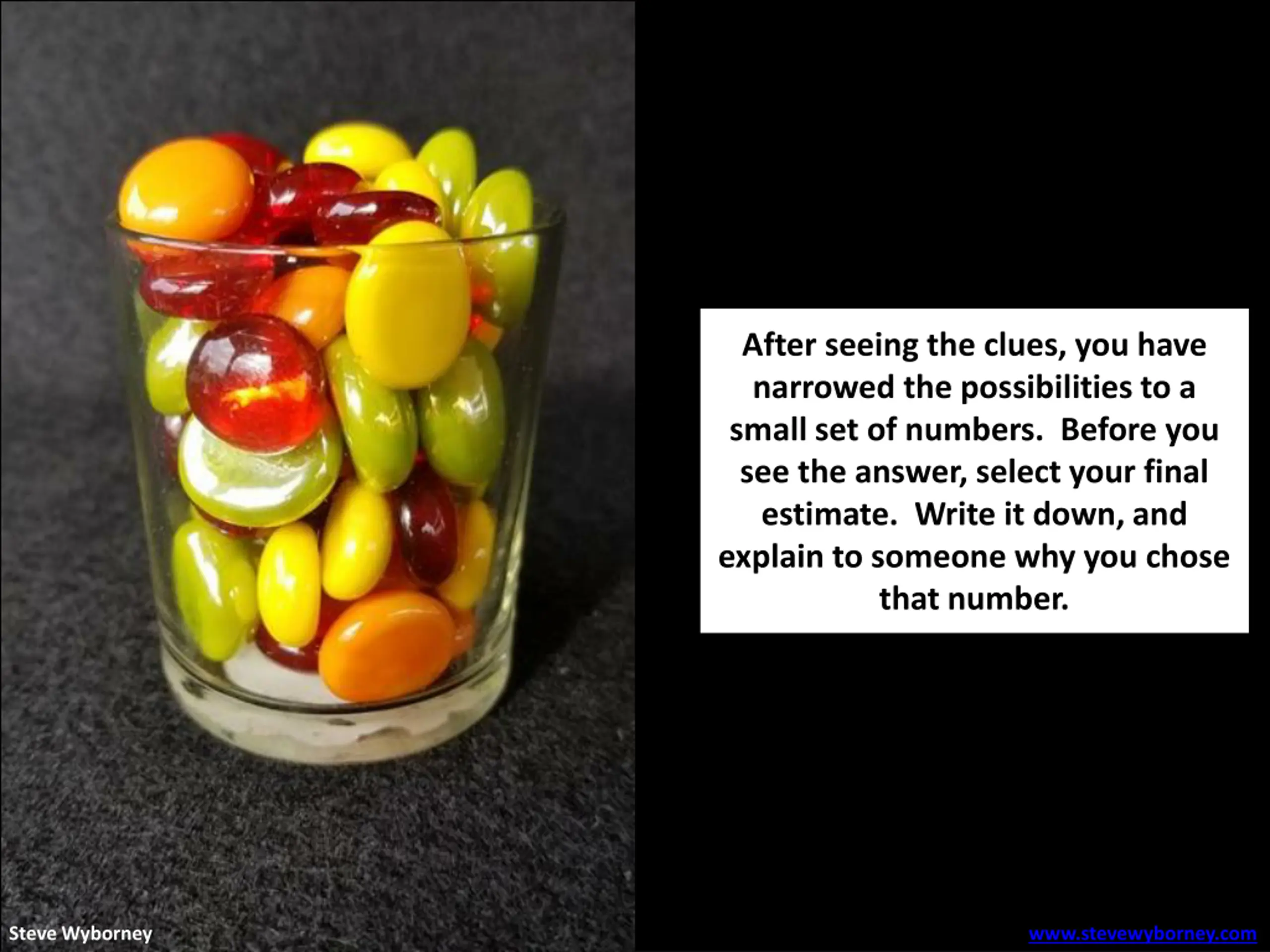After seeing the clues, you have narrowed the possibilities to a small set of numbers. Before you see the answer, select your final estimate. Write it down, and explain to someone why you chose that number. Steve Wyborney www.stevewyborney.com
