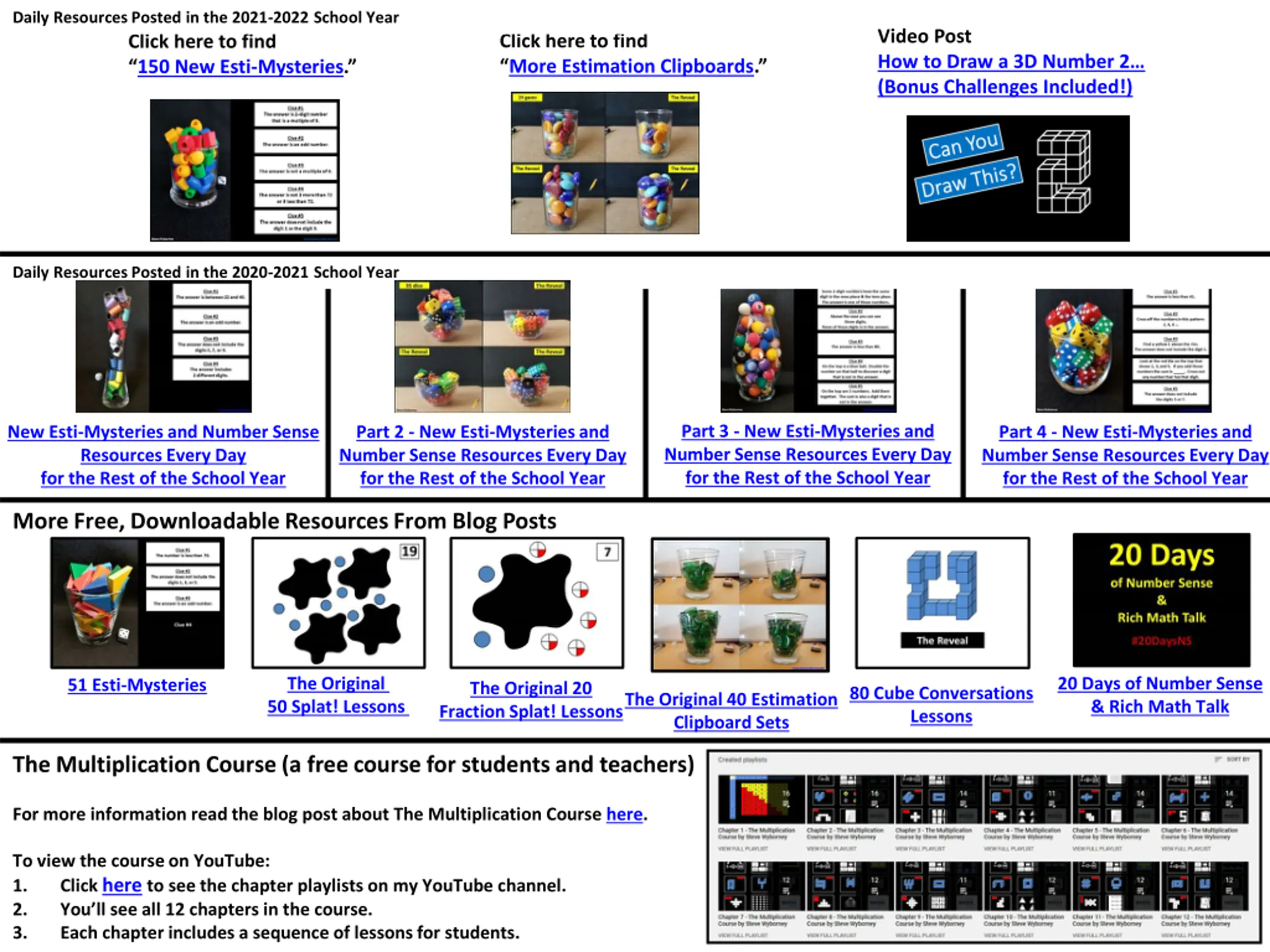 Daily Resources Posted in the 2021-2022 School Year Video Post How to Draw a 3D Number 2 (Bonus Challenges Included!) Click here to find More Estimation Clipboards. Click here to find 150 New Esti-Mysteries. Daily Resources Posted in the 2020-2021 School Year C:\Users\Steve Wyborney\Desktop\STEVES Esti-Mystery Clue Toolkit and Templates FALL 2020.jpg C:\Users\Steve Wyborney\Desktop\Blog Post Pics and email too\Clipboard Dice.jpg C:\Users\Steve Wyborney\Desktop\Blog Post Pics and email too\Part 3 Feature Pic.jpg C:\Users\Steve Wyborney\Desktop\Part 4 Featured Pic.jpg Part 3 - New Esti-Mysteries and Number Sense Resources Every Day for the Rest of the School Year New Esti-Mysteries and Number Sense Resources Every Day for the Rest of the School Year Part 2 - New Esti-Mysteries and Number Sense Resources Every Day for the Rest of the School Year Part 4 - New Esti-Mysteries and Number Sense Resources Every Day for the Rest of the School Year More Free, Downloadable Resources From Blog Posts C:\Users\Steve Wyborney\Desktop\20 Days Title Pic.jpg C:\Users\Steve Wyborney\Desktop\SPLAT blog post folder\Splat Promo Images and GIFs\Splat Level 3 B.jpg C:\Users\Steve Wyborney\Desktop\Splat Promos HUGE SET\Slide6.JPG C:\Users\Steve Wyborney\Desktop\Presentation1.jpg C:\Users\Steve Wyborney\Desktop\8.8.2018 Desktop\Estimation Clipboard Desktop Materials\Bundle 1 Glasses Pic.jpg 20 Days of Number Sense Rich Math Talk 51 Esti-Mysteries The Original 50 Splat! Lessons 20 Days of Number Sense & Rich Math Talk 51 Esti-Mysteries The Original 20 Fraction Splat! Lessons 80 Cube Conversations Lessons The Original 40 Estimation Clipboard Sets The Multiplication Course (a free course for students and teachers) For more information read the blog post about The Multiplication Course here. To view the course on YouTube: 1. Click here to see the chapter playlists on my YouTube channel. 2. You ll see all 12 chapters in the course. 3. Each chapter includes a sequence of lessons for students.