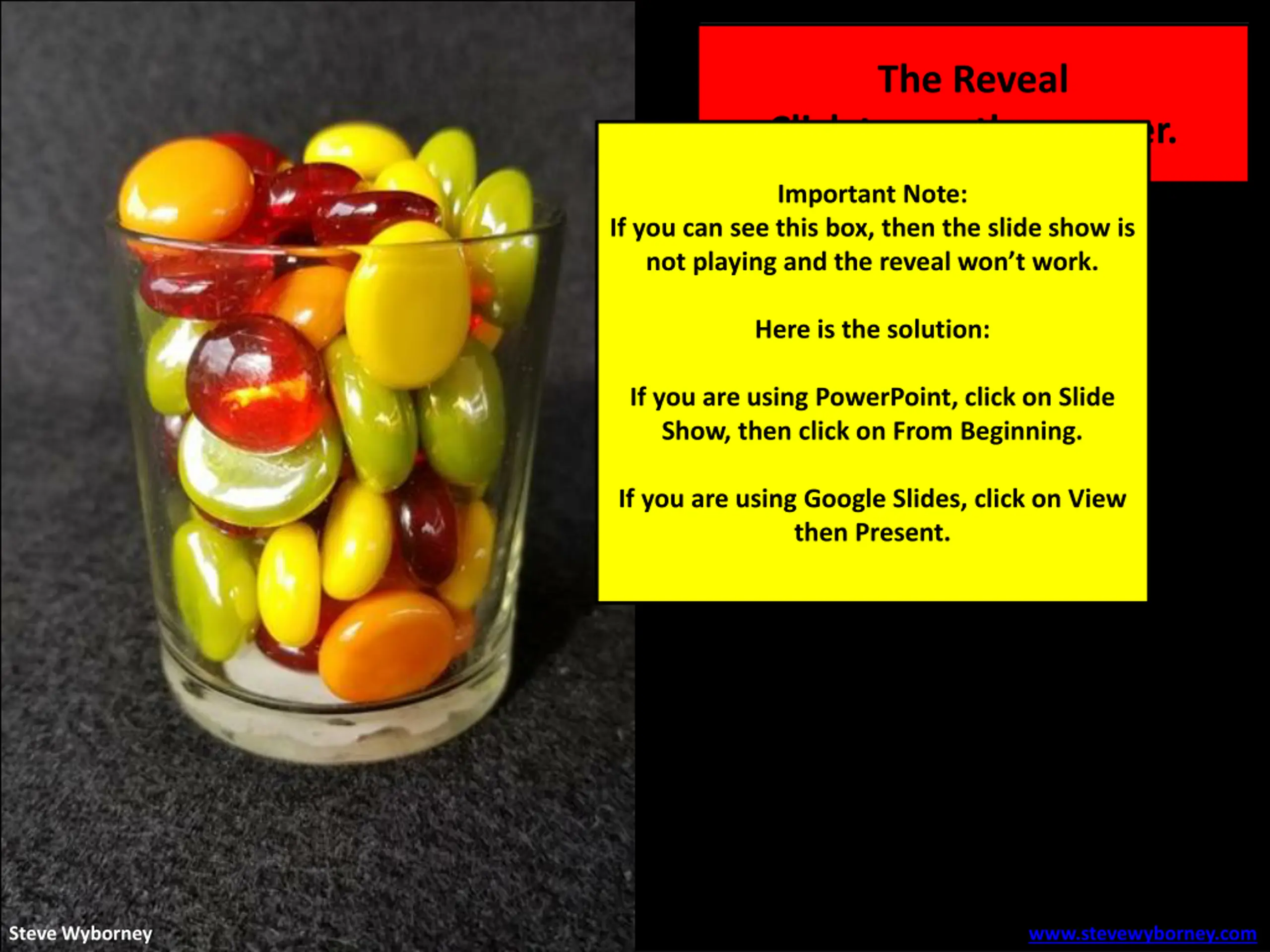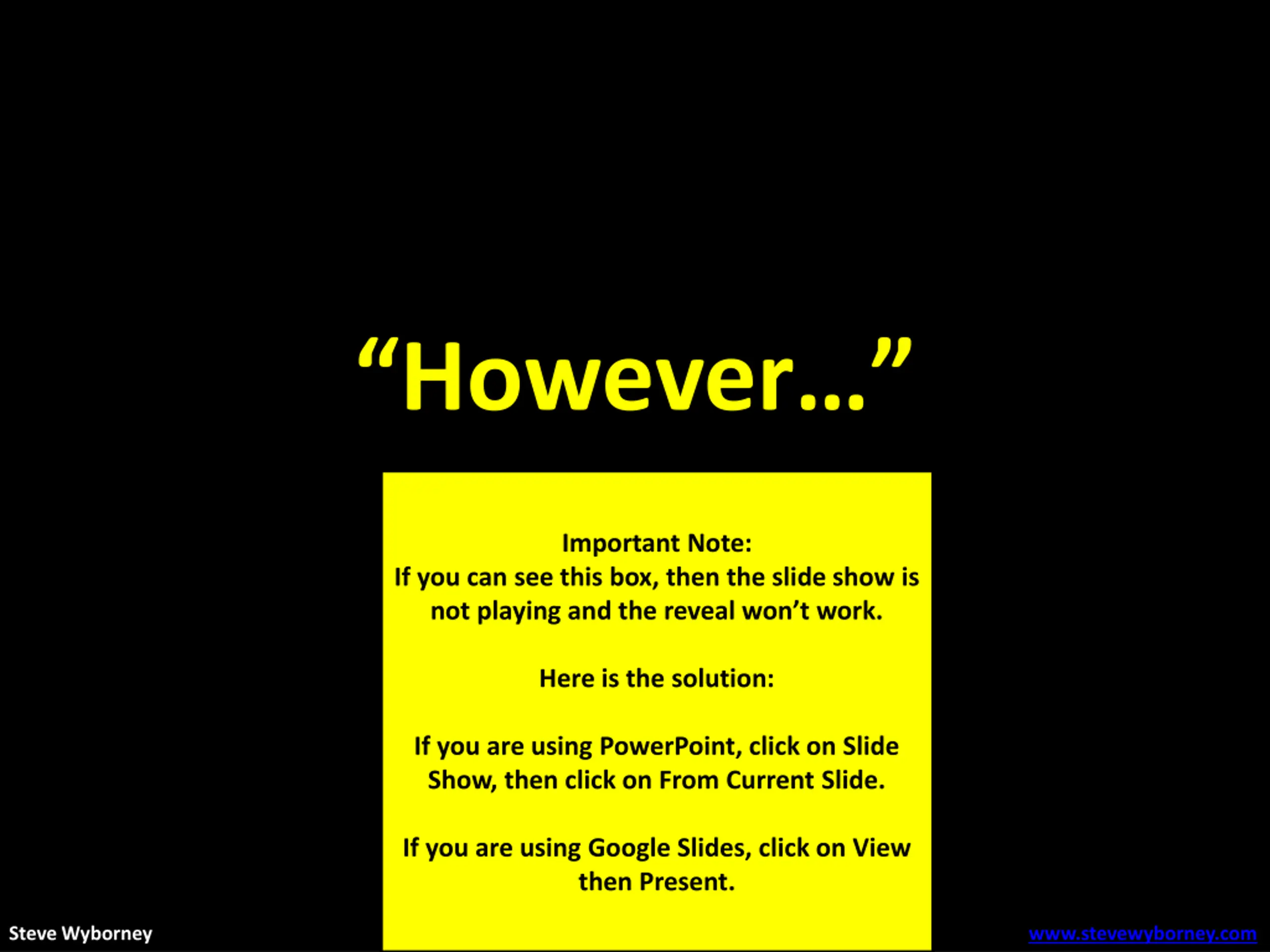 However Important Note: If you can see this box, then the slide show is not playing and the reveal won t work. Here is the solution: If you are using PowerPoint, click on Slide Show, then click on From Current Slide. If you are using Google Slides, click on View then Present. Steve Wyborney www.stevewyborney.com