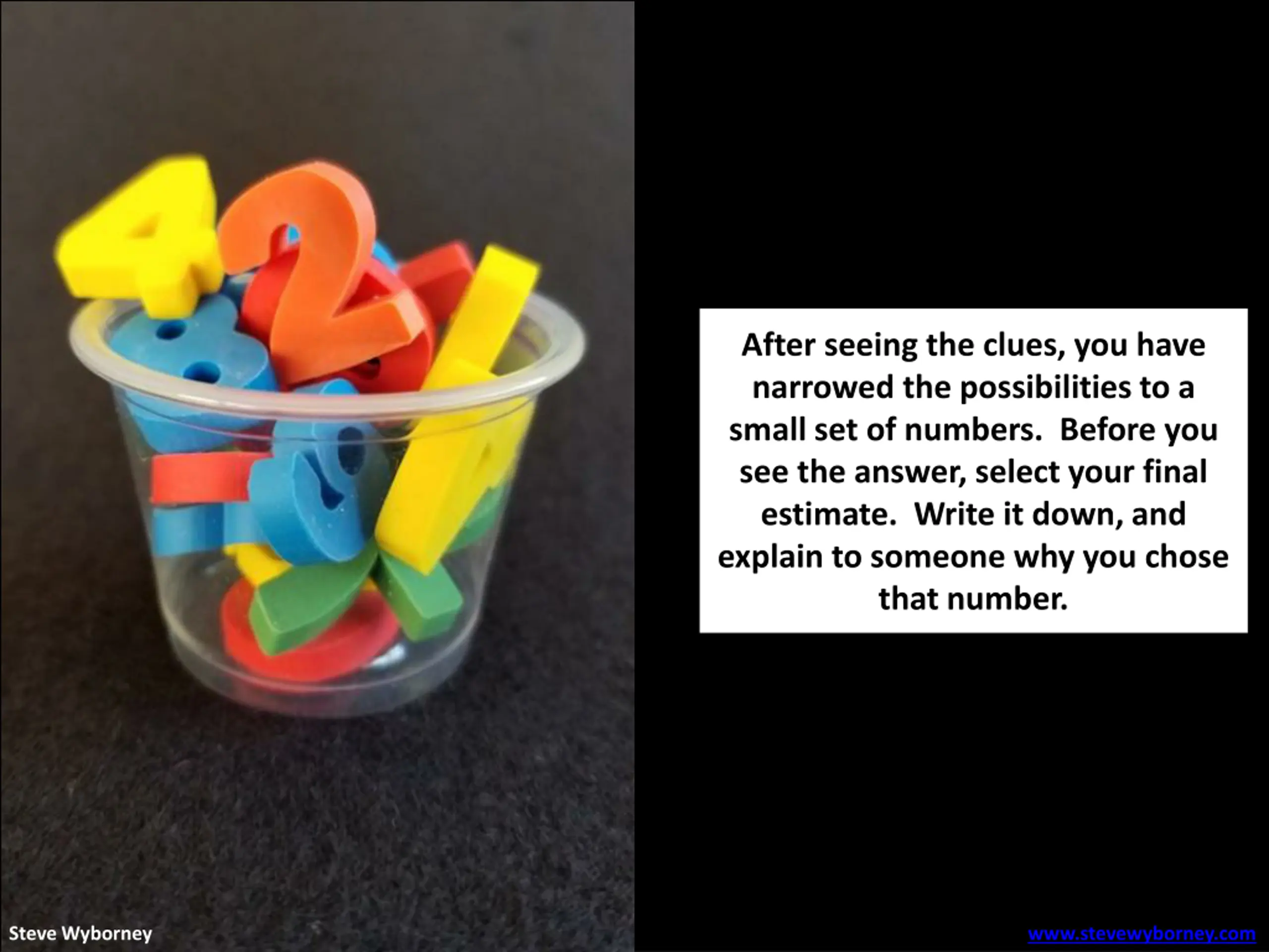 After seeing the clues, you have narrowed the possibilities to a small set of numbers. Before you see the answer, select your final estimate. Write it down, and explain to someone why you chose that number. Steve Wyborney www.stevewyborney.com