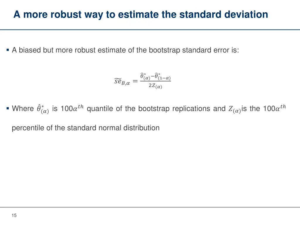 A more robust way to estimate the standard deviation A biased but more robust estimate of the bootstrap standard error is: ?(?) ?(1 ?) 2?(?) ???,?= Where ?(?) is 100?? quantile of the bootstrap replications and ?(?)is the 100?? percentile of the standard normal distribution 15