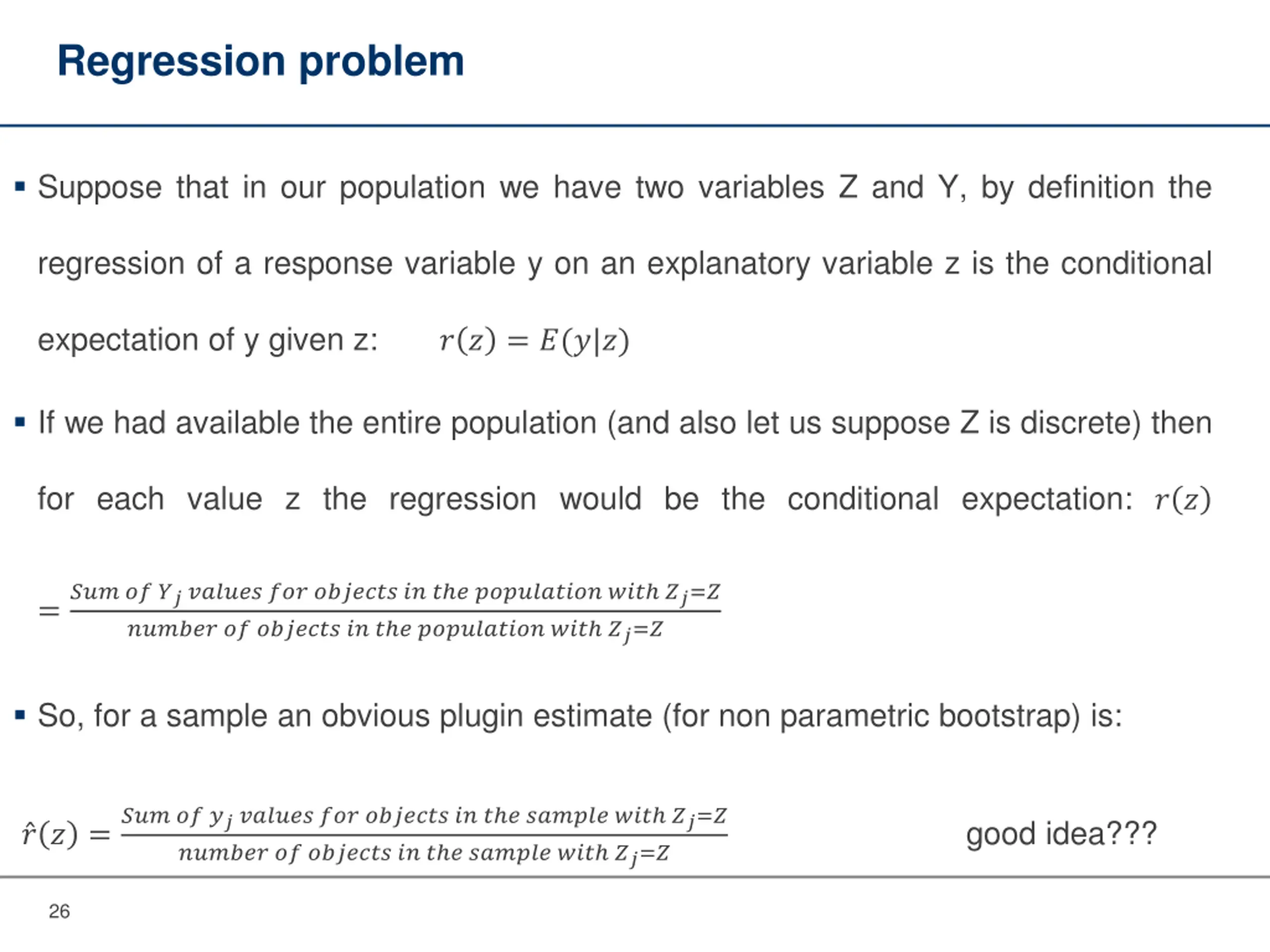 Regression problem Suppose that in our population we have two variables Z and Y, by definition the regression of a response variable y on an explanatory variable z is the conditional expectation of y given z: ? ? = ?(?|?) If we had available the entire population (and also let us suppose Z is discrete) then for each value z the regression would be the conditional expectation: ? ? ??? ?? ???????? ??? ??????? ?? ? ? ?????????? ??? ??=? ?????? ?? ??????? ?? ? ? ?????????? ??? ??=? = So, for a sample an obvious plugin estimate (for non parametric bootstrap) is: ??? ?? ???????? ??? ??????? ?? ? ? ?????? ??? ??=? ?????? ?? ??????? ?? ? ? ?????? ??? ??=? good idea??? ? ? = 26