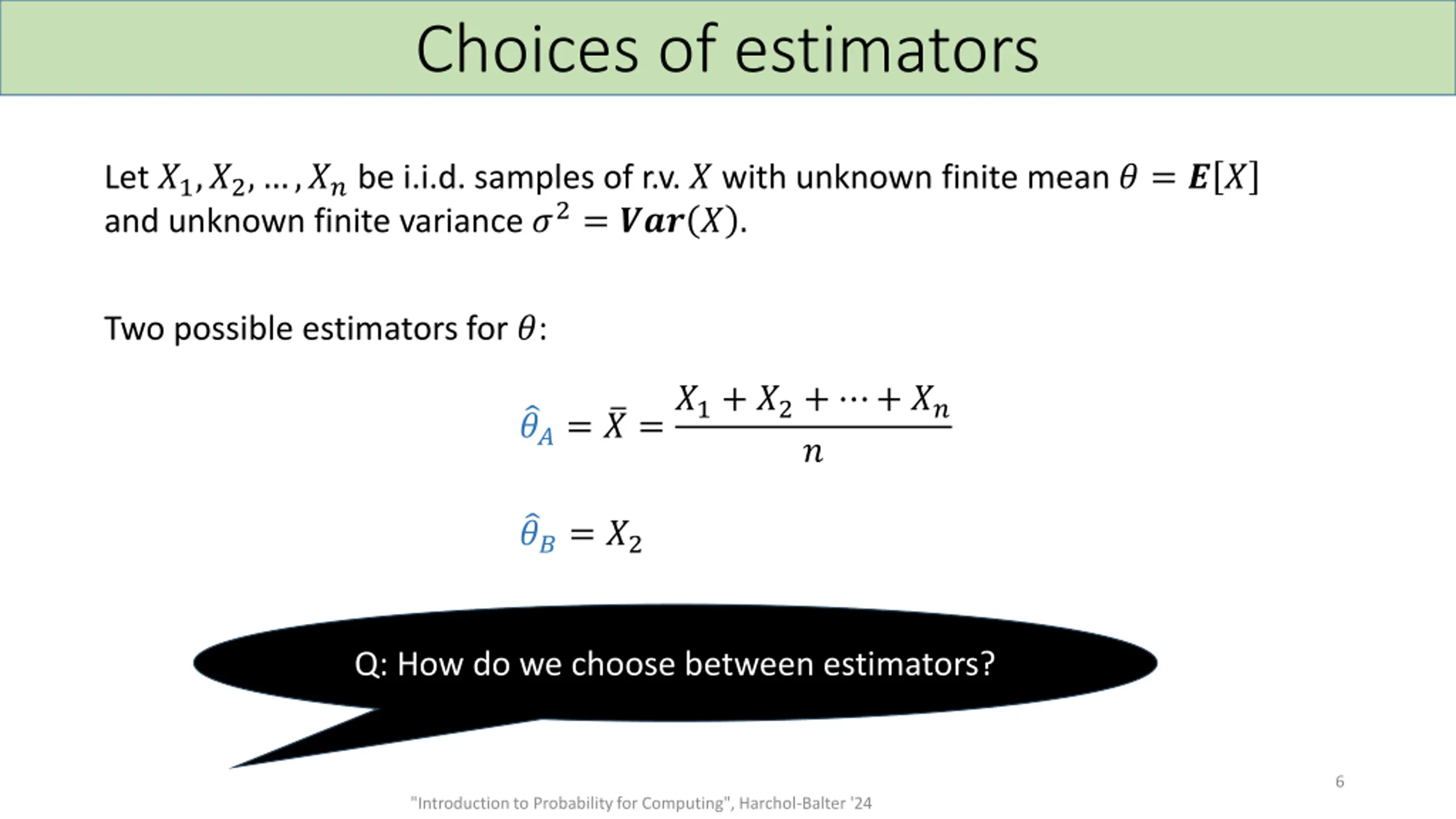 Choices of estimators Let ?1,?2, ,?? be i.i.d. samples of r.v. ? with unknown finite mean ? = ? ? and unknown finite variance ?2= ??? ? . Two possible estimators for ?: ??= ? =?1+ ?2+ + ?? ? ??= ?2 Q: How do we choose between estimators? 6 "Introduction to Probability for Computing", Harchol-Balter '24