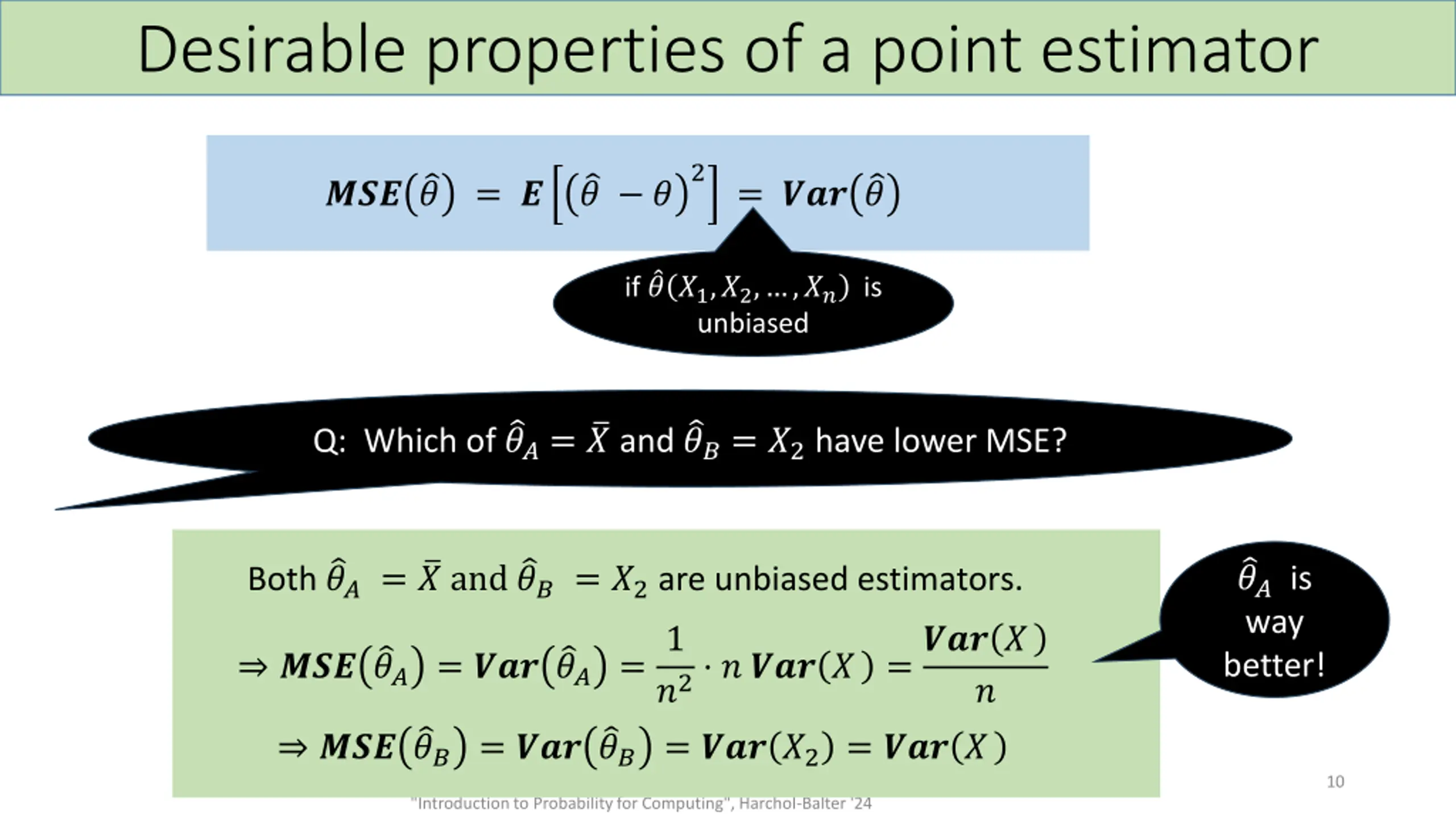 Desirable properties of a point estimator Defn 15.4: The mean squared error (MSE) of estimator ? ?1,?2, ,??is: Low MSE is desirable property #2 2 ??? ? = ? ? ? Lemma 15.5: If ? ?1,?2, ,??is an unbiased estimator, then ??? ? = ??? ? 2 2 Proof:??? ? = ? = ??? ? ? ? ? ? ? =? 9 "Introduction to Probability for Computing", Harchol-Balter '24