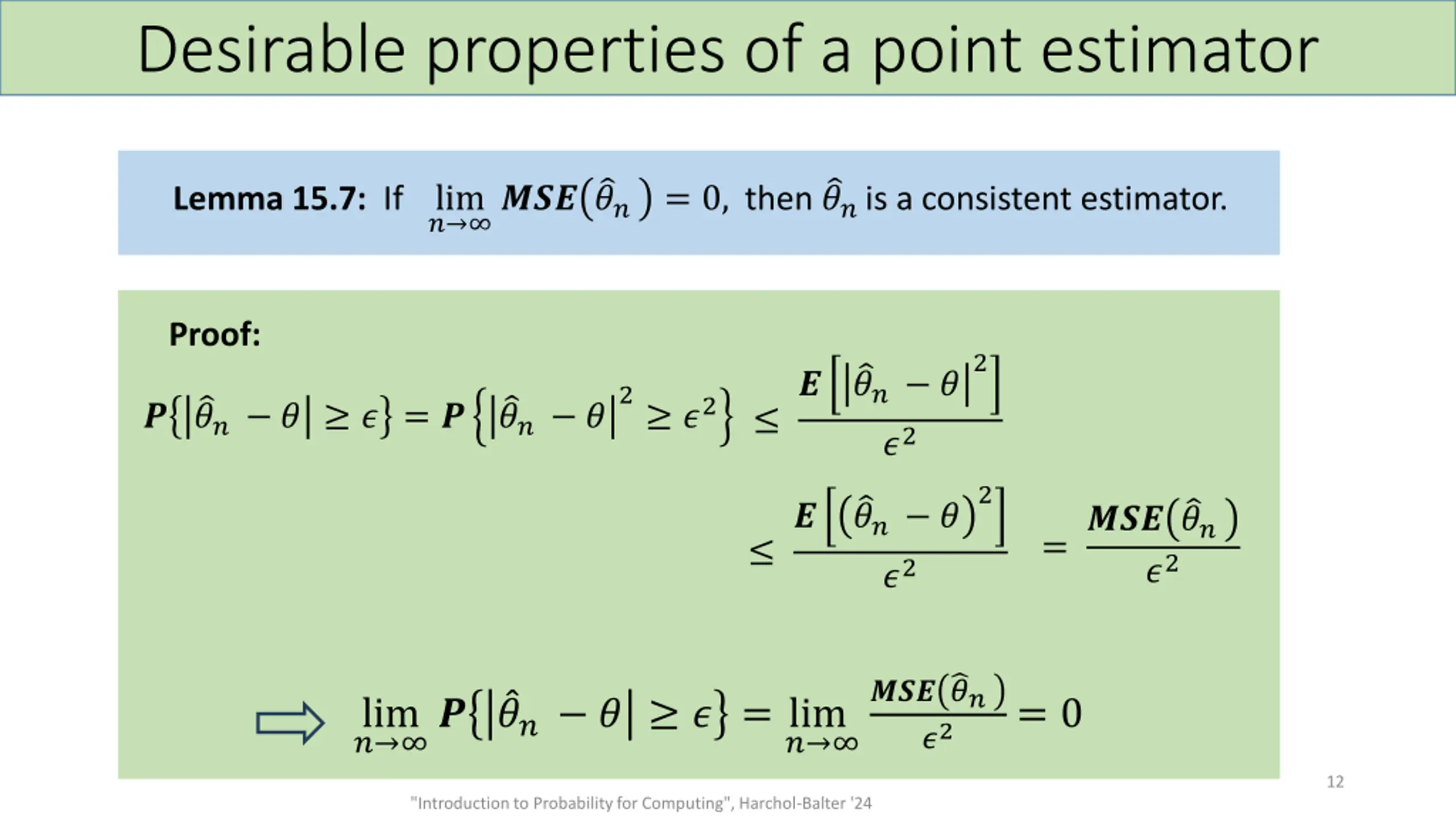 Desirable properties of a point estimator Defn 15.4: The mean squared error (MSE) of estimator ? ?1,?2, ,??is: Low MSE is desirable property #2 2 ??? ? = ? ? ? What metric does this remind you of? 8 "Introduction to Probability for Computing", Harchol-Balter '24