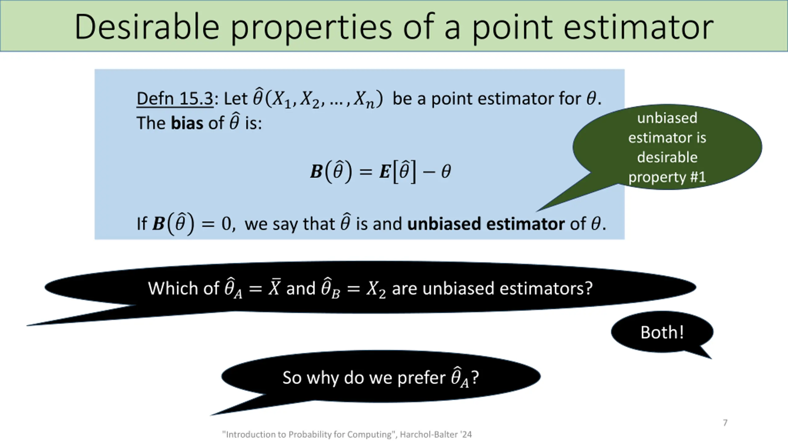 Desirable properties of a point estimator Defn 15.3: Let ? ?1,?2, ,??be a point estimator for ?. The bias of ? is: unbiased estimator is desirable property #1 ? ? = ? ? ? If ? ? = 0, we say that ? is and unbiased estimator of ?. Which of ??= ? and ??= ?2are unbiased estimators? Both! So why do we prefer ??? 7 "Introduction to Probability for Computing", Harchol-Balter '24