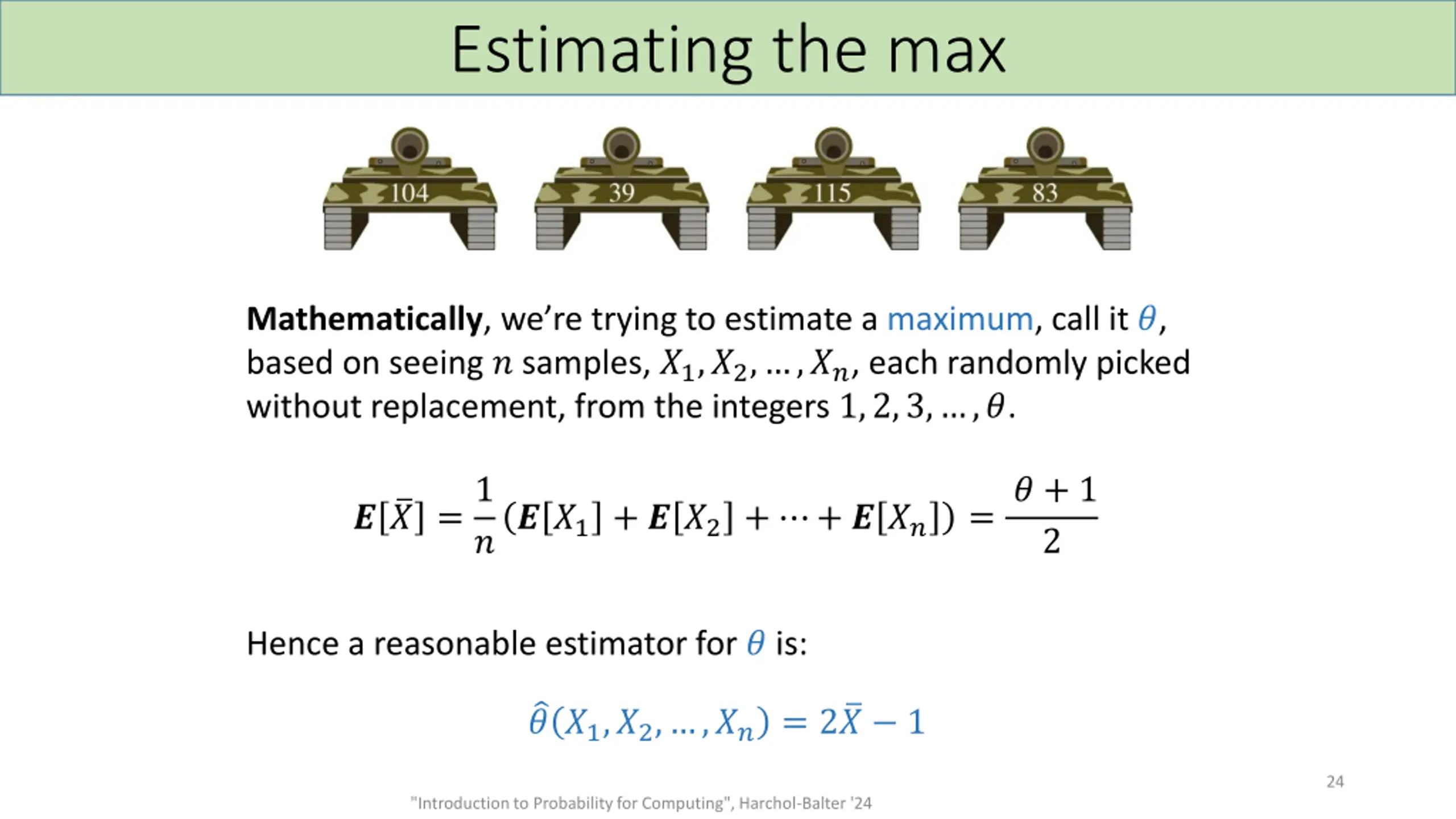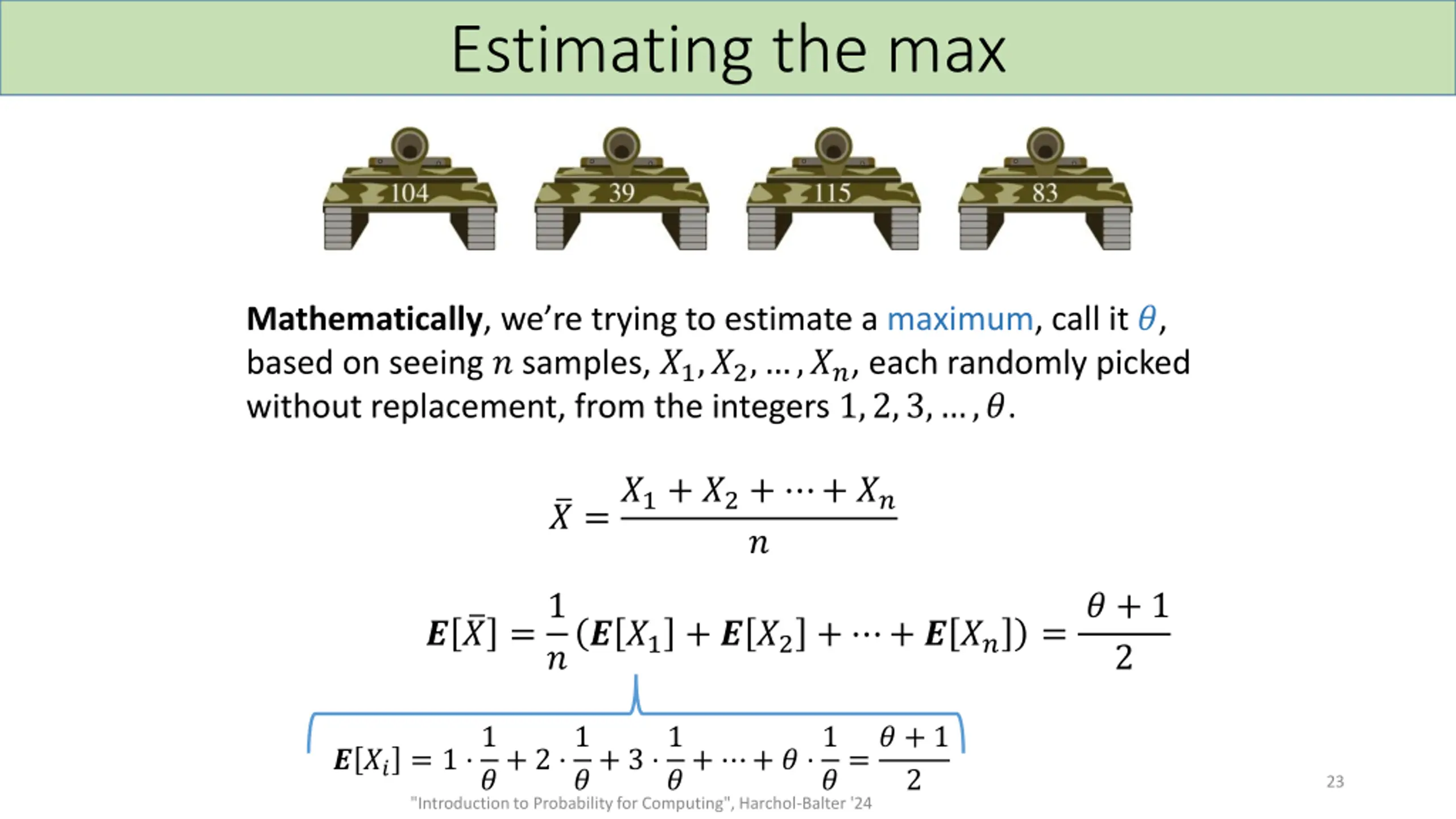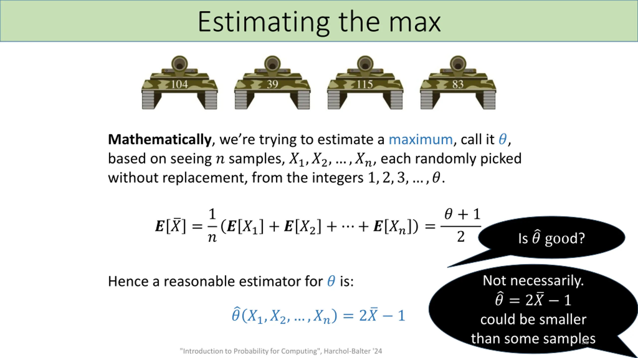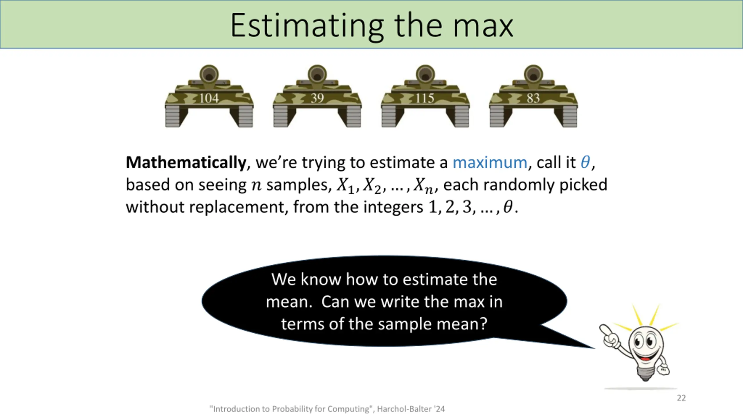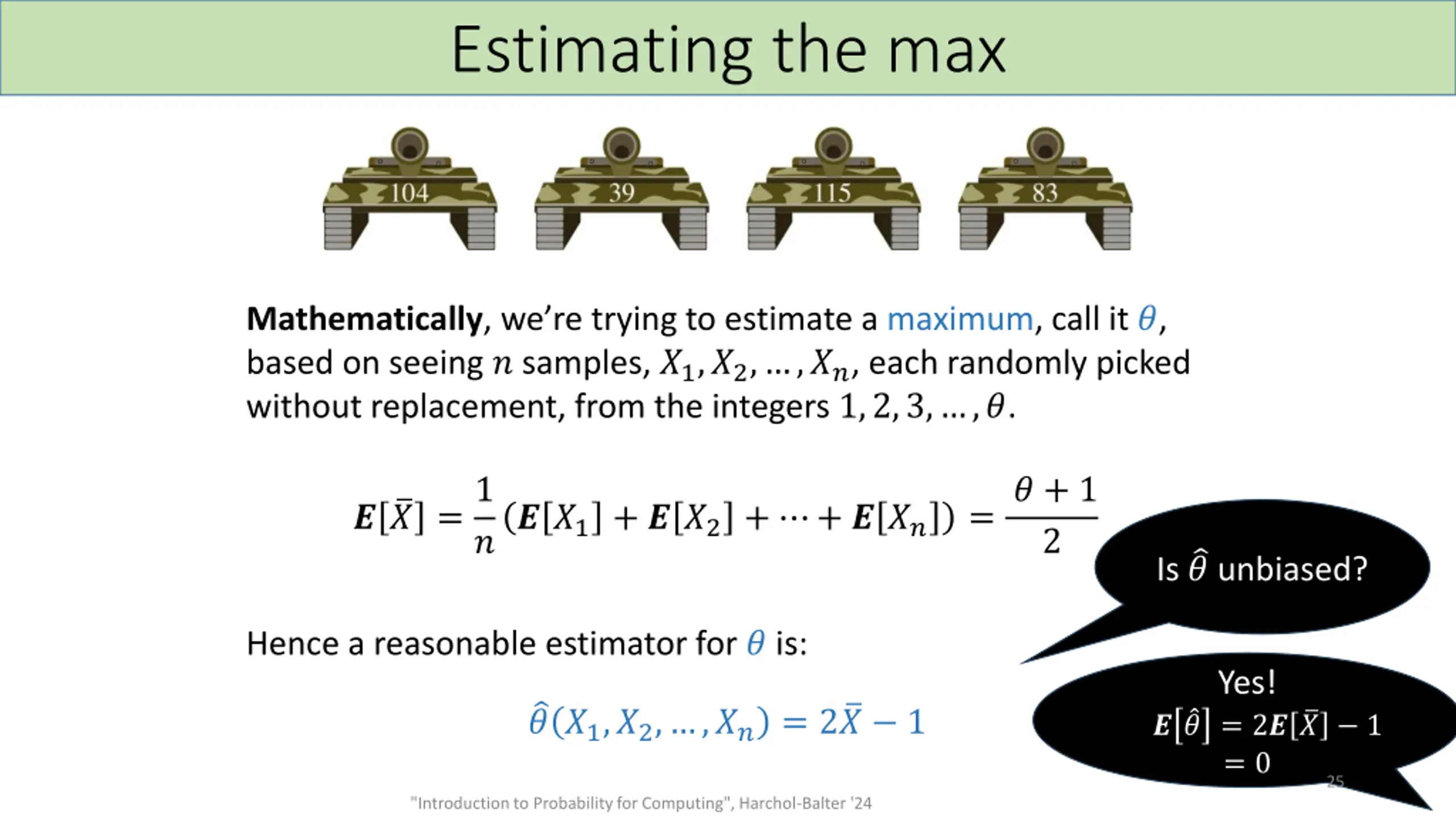 More complex estimators The sample mean estimator is often a component of more complex estimators. Consider the following example: Goal: Estimate # German tanks in WW II. Each tank has serial number. Below are the tanks we ve seen so far Mathematically, we re trying to estimate a maximum, call it ?, based on seeing ? samples, ?1,?2, ,??, each randomly picked without replacement, from the integers 1,2,3, ,?. 21 "Introduction to Probability for Computing", Harchol-Balter '24