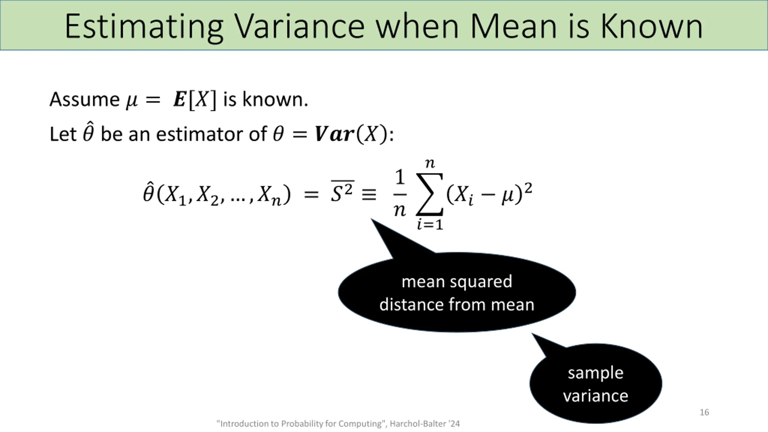 Estimating Variance when Mean is Known Assume ? = ?[?] is known. Let ? be an estimator of ? = ??? ? : ? ? ?1,?2, ,?? = ?2 1 ?? ?2 ? ?=1 mean squared distance from mean sample variance 16 "Introduction to Probability for Computing", Harchol-Balter '24